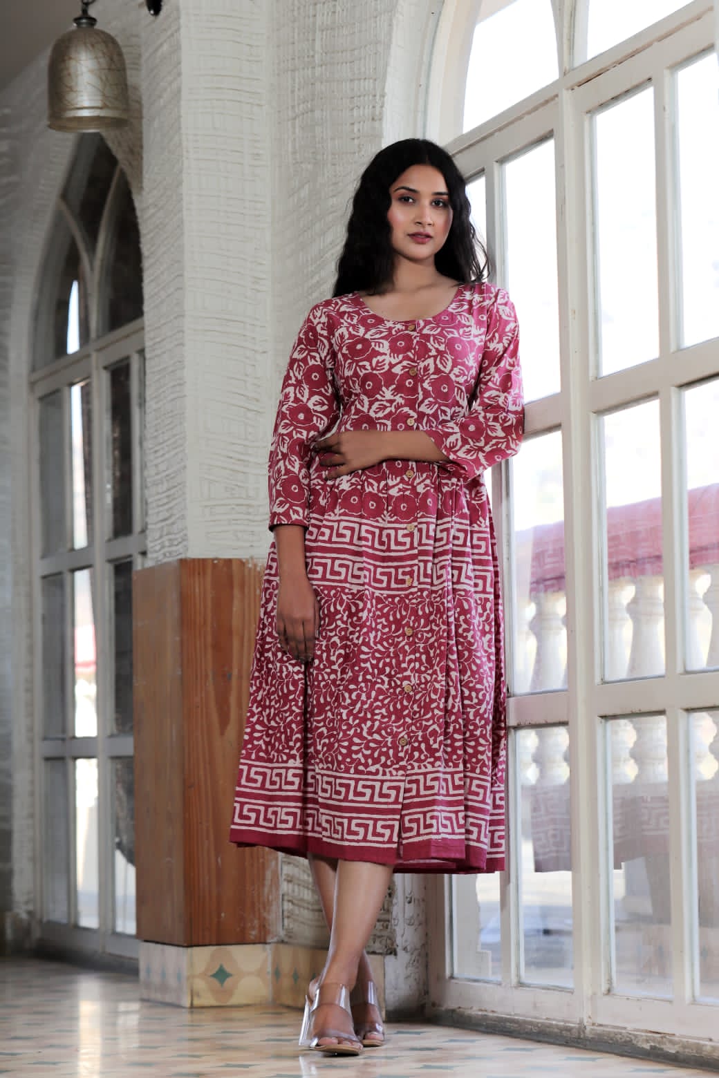 Aliya Bagru Block Printed Cotton Midi Dress in Reddish-Pink