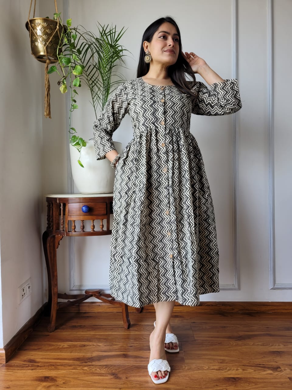 Elevate your wardrobe with our exquisite Aliya Zigzag Hand Block Printed Cotton Midi Dress. Crafted with precision using traditional Bagru block printing techniques, this dress features a delightful zigzag pattern in black and white, adding a touch of artisanal charm. Made from premium cotton 60*60 super dying fabric, it offers a soft, breathable feel for all-day comfort. The dress boasts a button-down front, long flared sleeves, a gathered waistline for a flattering silhouette, and convenient side pockets. Perfect for everyday elegance or semi-formal occasions.
