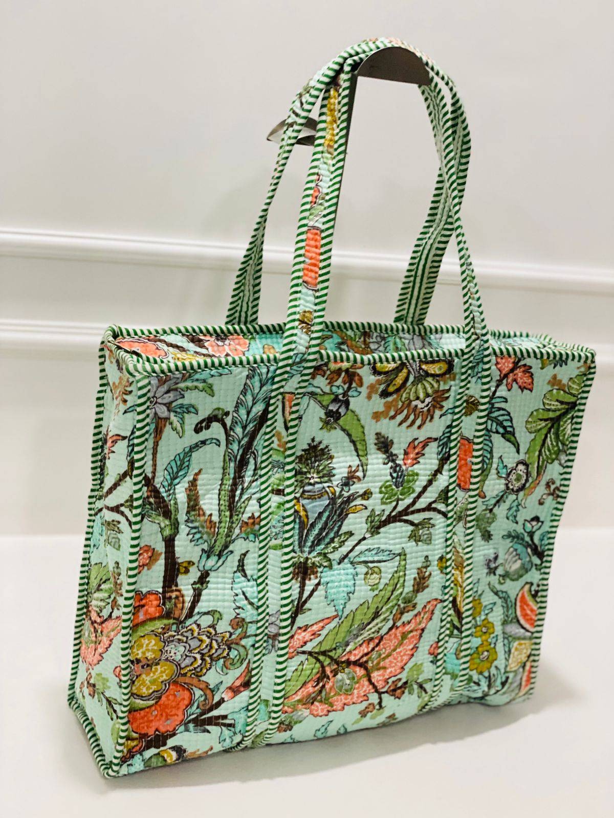 Embrace the elegance of the Aqua Floral Bliss Quilted Cotton Tote Bag, a masterpiece of handblock printing artistry. The light turquoise base adorned with a multicolored floral and leafy pattern in shades of green, orange, yellow, brown, and white exudes a vibrant charm. The quilted cotton fabric offers a soft yet sturdy texture, ensuring durability and style in one. Whether for shopping or casual outings, the medium-sized bag with structured form and green and white striped trim handles adds a touch of sophistication to any ensemble.