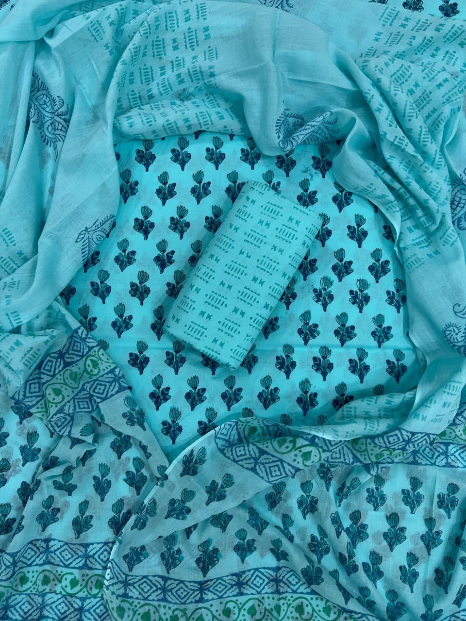 Embrace the spirit of Indian craftsmanship with our Aqua Floral Dream Cotton Suit Set, thoughtfully designed to bring comfort and style together. This exquisite ensemble is made from 100% pure cotton, ensuring breathability and ease for your everyday wear.