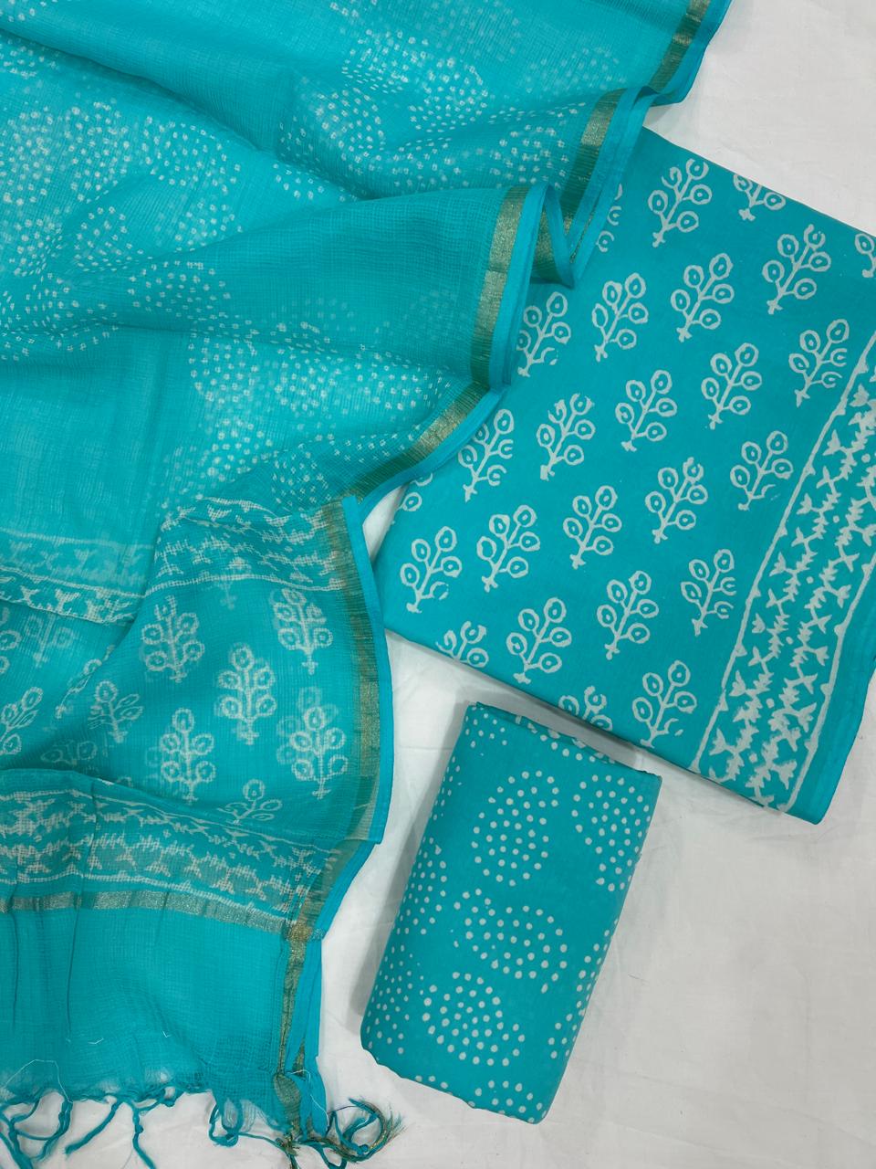 Rooted in a tradition where craftsmanship reigns, this aqua floral elegance cotton dress material embodies the artistry of hand block printing. Adorning a smooth canvas in vibrant aqua blue, the fabric features intricate floral motifs that elegantly dance against an off-white backdrop, accented by a shimmering golden trim. Each piece tells a story, showcasing the skillful precision of artisans who pour their heart into every detail.