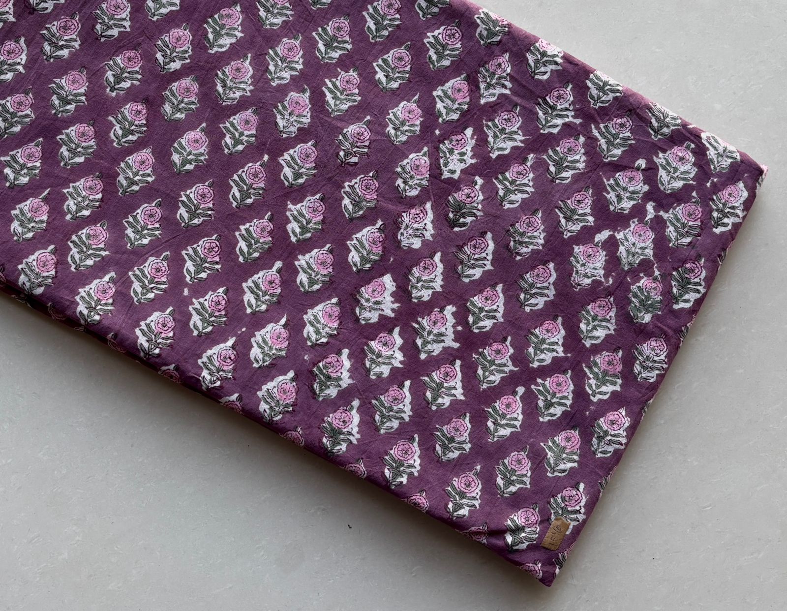 Let your creativity flourish with the Aubergine Rose Blossom Cotton Running Fabric, a tribute to the timeless artistry of Indian craftsmanship. This enchanting textile features delicate rose motifs in soft pastel pink against a lush aubergine backdrop, evoking a sense of romantic elegance.