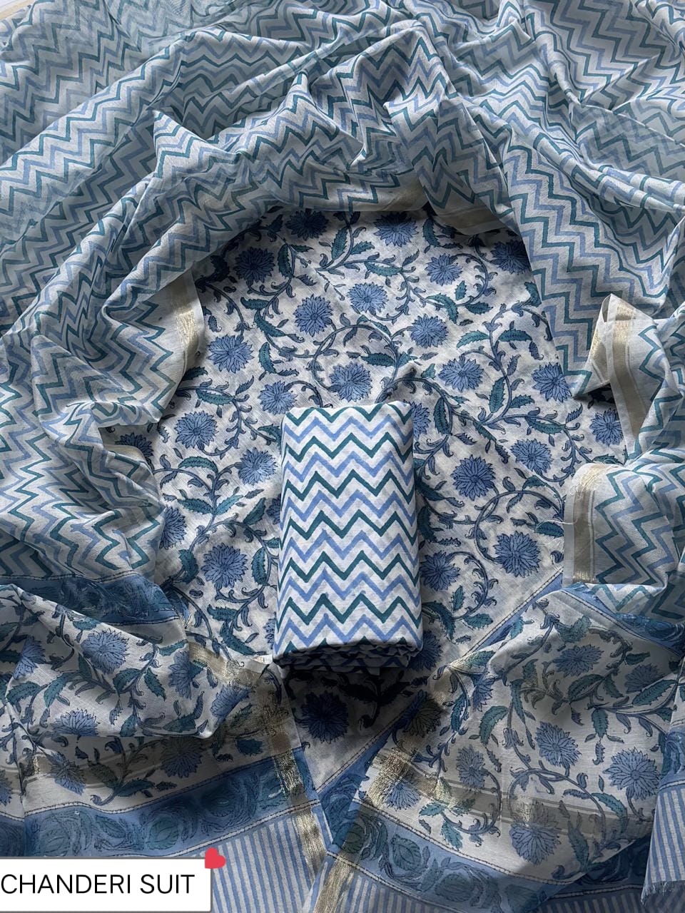 This hand block printed chanderi silk dress materials with chanderi silk duptta set includes: