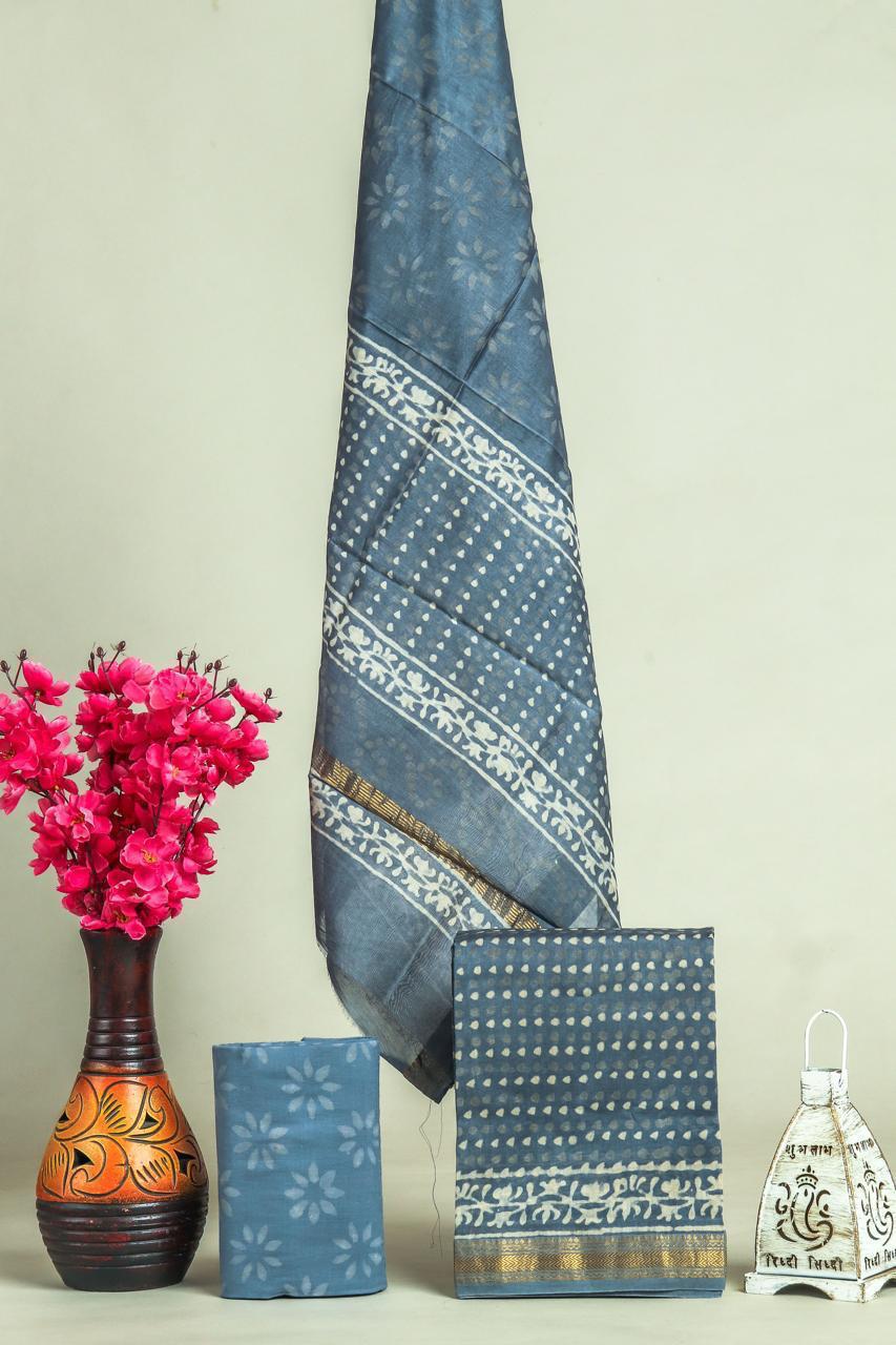 Embark on a journey of artistry with the Azure Blossom Cotton Maheshwari Silk Suit Ensemble. Inspired by traditional Indian crafts, this ensemble features intricate floral and dotted patterns in white, complemented by elegant gold accents. Crafted with care, the fabric is a blend of Maheshwari silk and soft cotton, ensuring comfort and style. Explore various styling options, from graceful sarees to chic dresses, and immerse yourself in the rich cultural heritage woven into every thread.