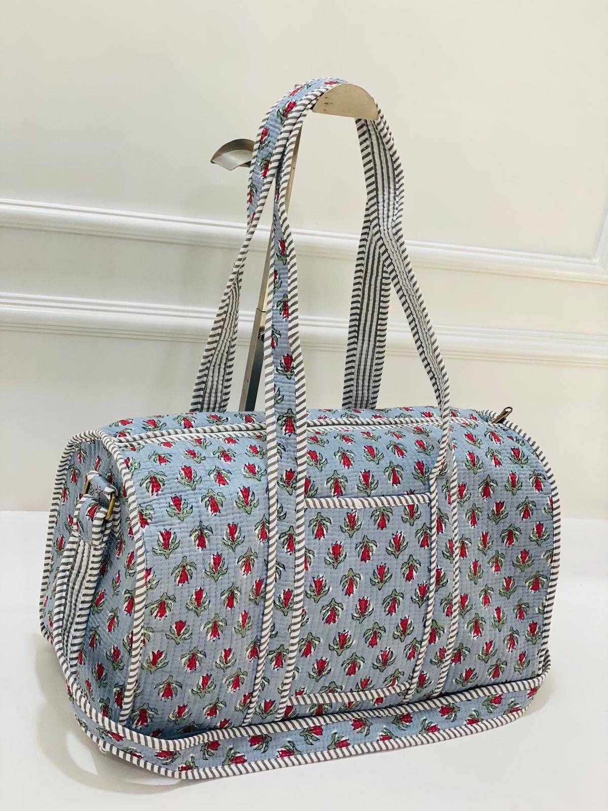 Embrace the unique charm of the Azure Blossom Floral Quilted Cotton Duffle Bag. The delicate floral pattern in red and green adds a touch of elegance to the light blue fabric. The quilted texture not only provides a padded look but also ensures lasting wear. The artisan techniques of hand block printing are evident in the meticulous placement of the floral motifs. Practical benefits include a spacious design ideal for all your essentials, while the emotional connection lies in carrying a piece of authentic Indian craftsmanship wherever you go.