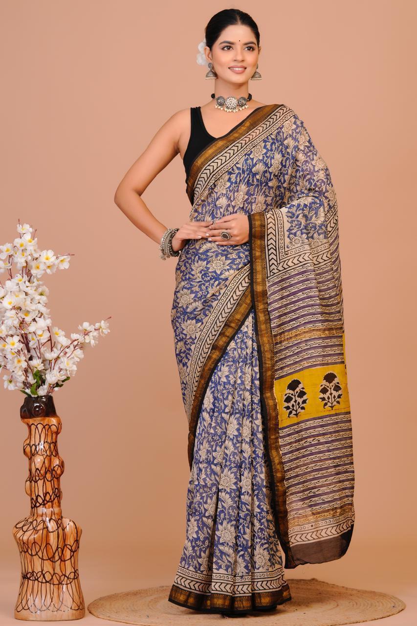 Expertly hand block printed with intricate floral patterns in beige on a serene blue canvas, this saree is a testament to Indian craftsmanship.