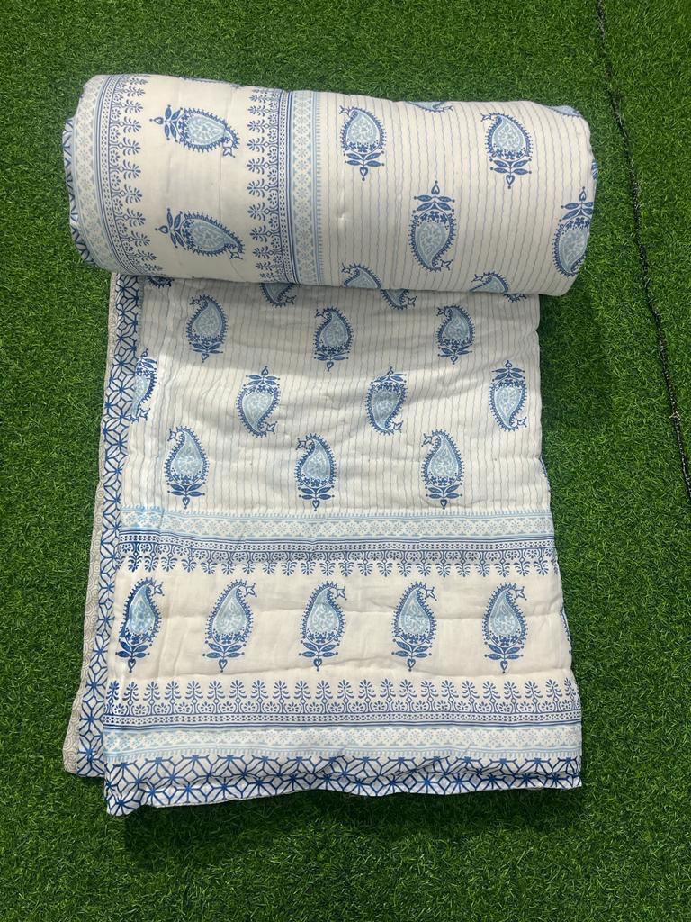 Each piece of our Azure Paisley Cotton Quilt narrates a story steeped in tradition, combining the timeless beauty of vibrant paisley motifs with the comforts of modern living. Carefully made for lasting wear, this quilt reflects the intricate artistry of hand block printing, where every motif is a testament to the skilled craftsmanship that defines Indian textiles.