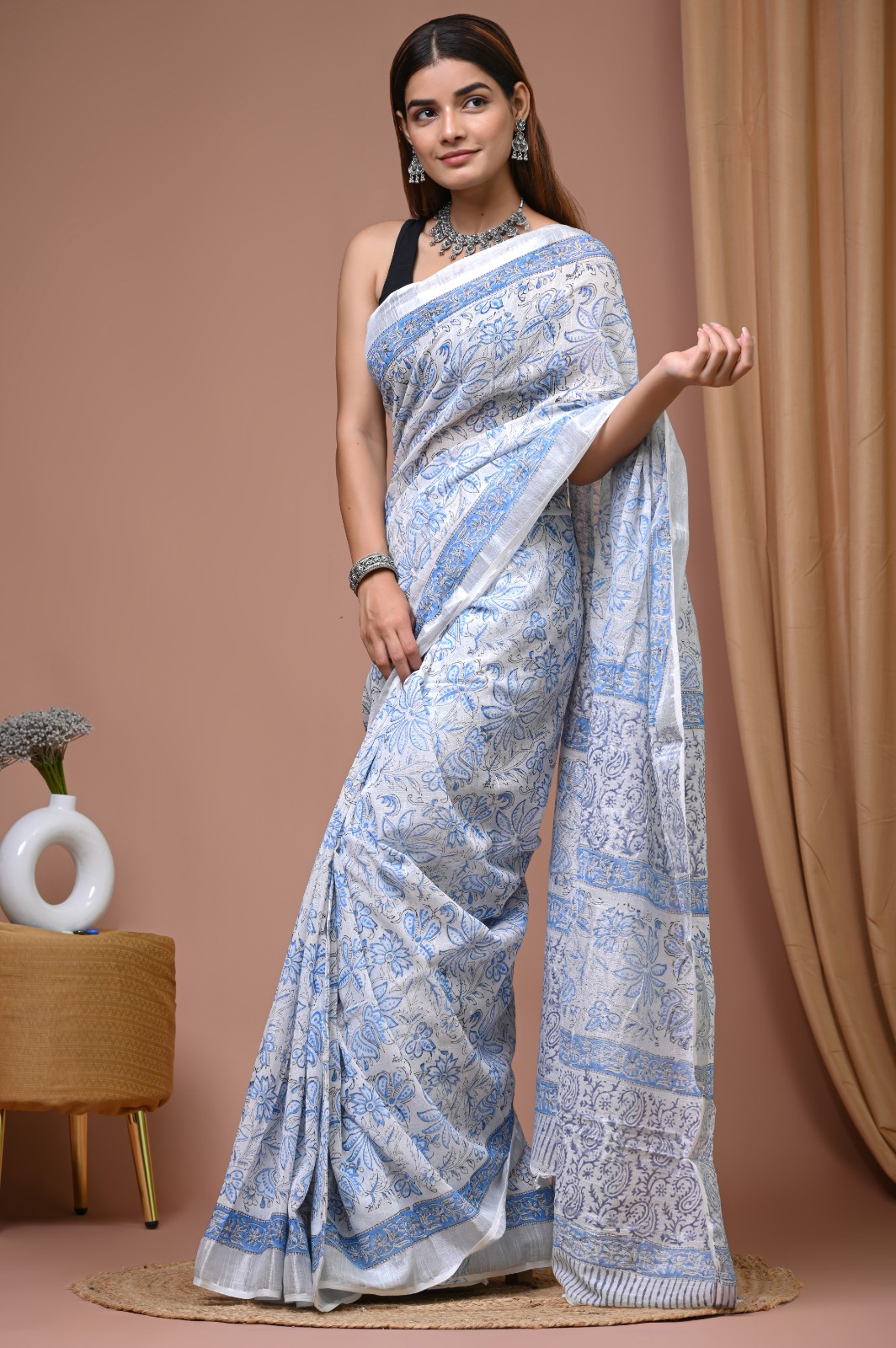 Rooted in the heart of Indian artistry, this Azure Petals Hand Block Printed Linen Saree is a stunning representation of traditional craftsmanship and modern elegance. The soft white fabric serves as a canvas for intricate light blue floral and paisley motifs, creating a harmonious design that captivates the eye.