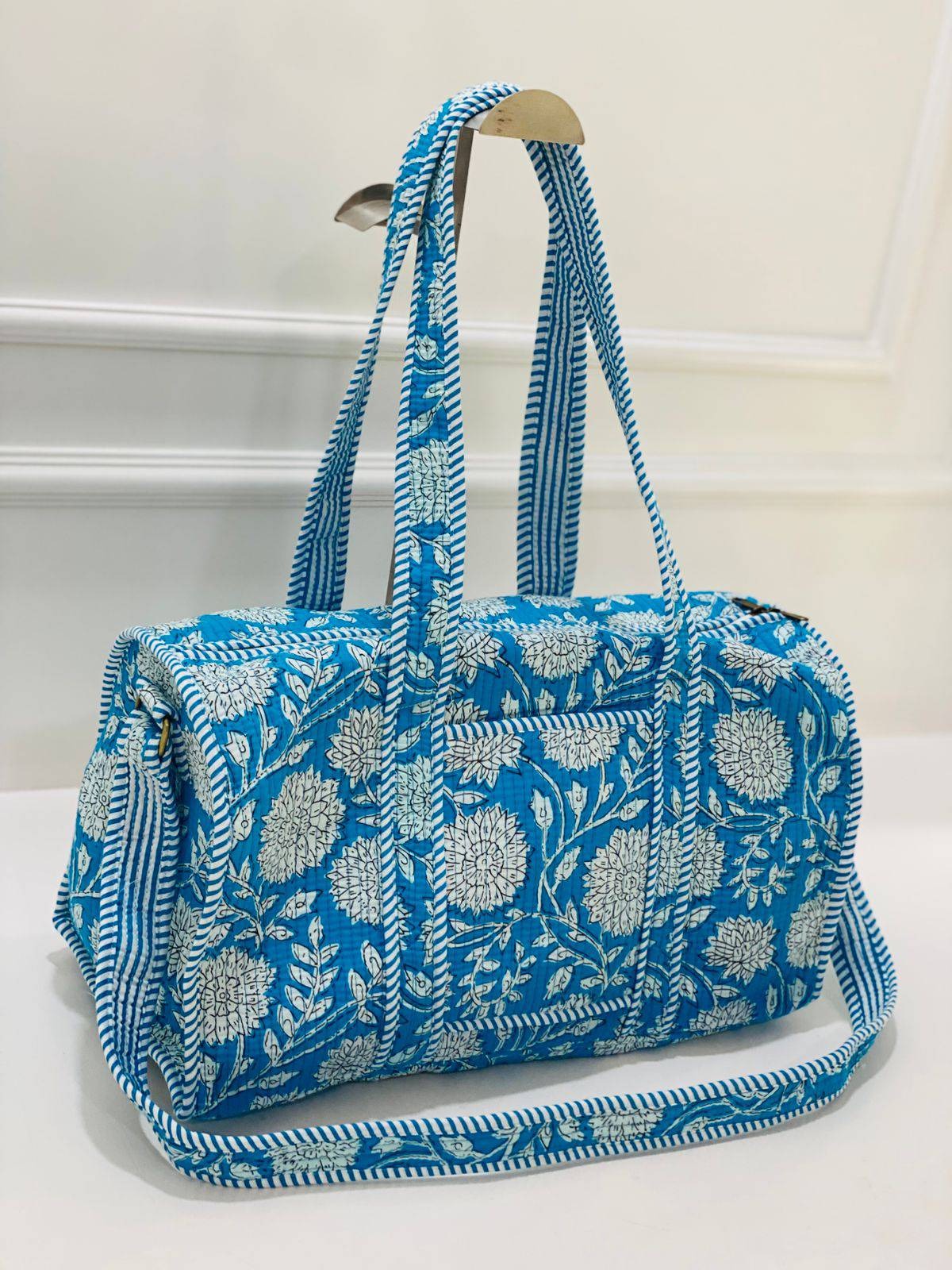 Immerse yourself in the artisan's vision with this exquisite handbag from Blockart. Each piece is meticulously crafted with hand block prints, reflecting the rich Indian textile traditions. The vibrant azure sky color, adorned with intricate floral patterns and striped accents, showcases a blend of sophistication and cultural authenticity.