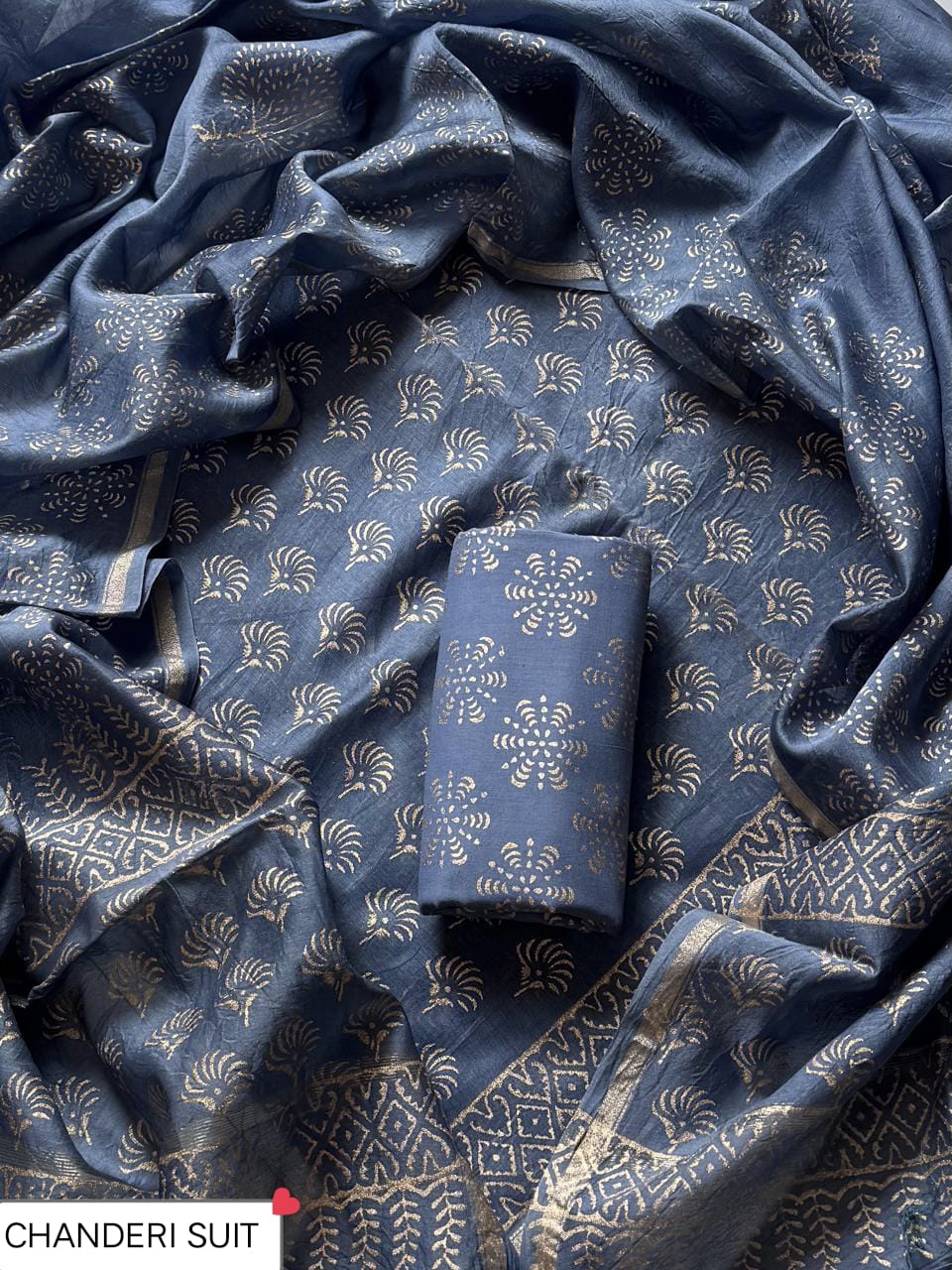 This hand block printed chanderi silk dress materials with chanderi silk duptta set includes: