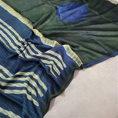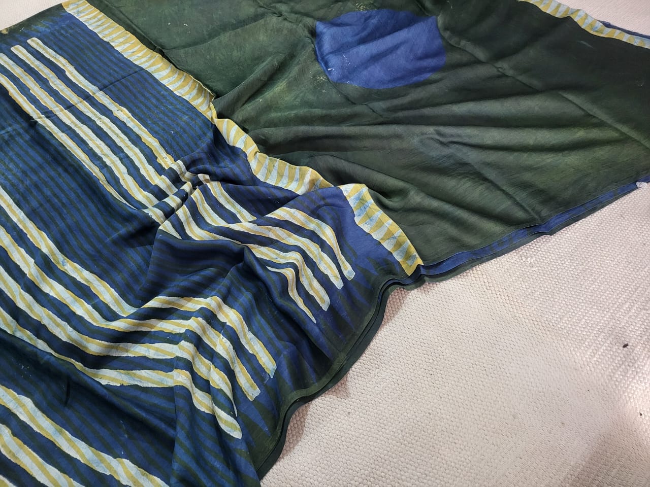Welcome to a world of elegance and charm with the Azure Symphony Striped Circular Modal Silk Saree by Blockart. This stunning piece features a harmonious blend of dark green and blue tones, adorned with a vibrant pattern of yellow and white stripes against a serene blue backdrop, while a bold dark green section showcases a large circular design. Crafted from luxurious modal silk, this saree exudes a lightweight and soft feel, ensuring a comfortable drape and gentle touch on your skin.
