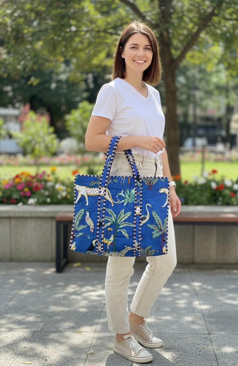 Step into the world of vibrant blue hues with our Azure Wildlife Quilted Cotton Tote Bag, adorned with a mesmerizing animal and plant print. The quilted fabric material adds a unique texture to this large tote bag, making it a statement piece for your ensemble. Crafted with care, this bag features sturdy handles for easy carrying and intricate patterns that complement the exotic wildlife design.