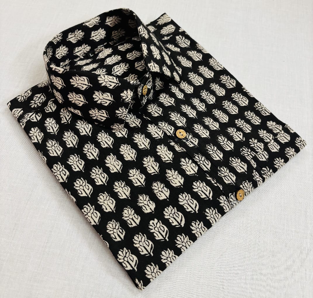 Bagru Block Printed Cotton Men's Shirt in Black and White Floral