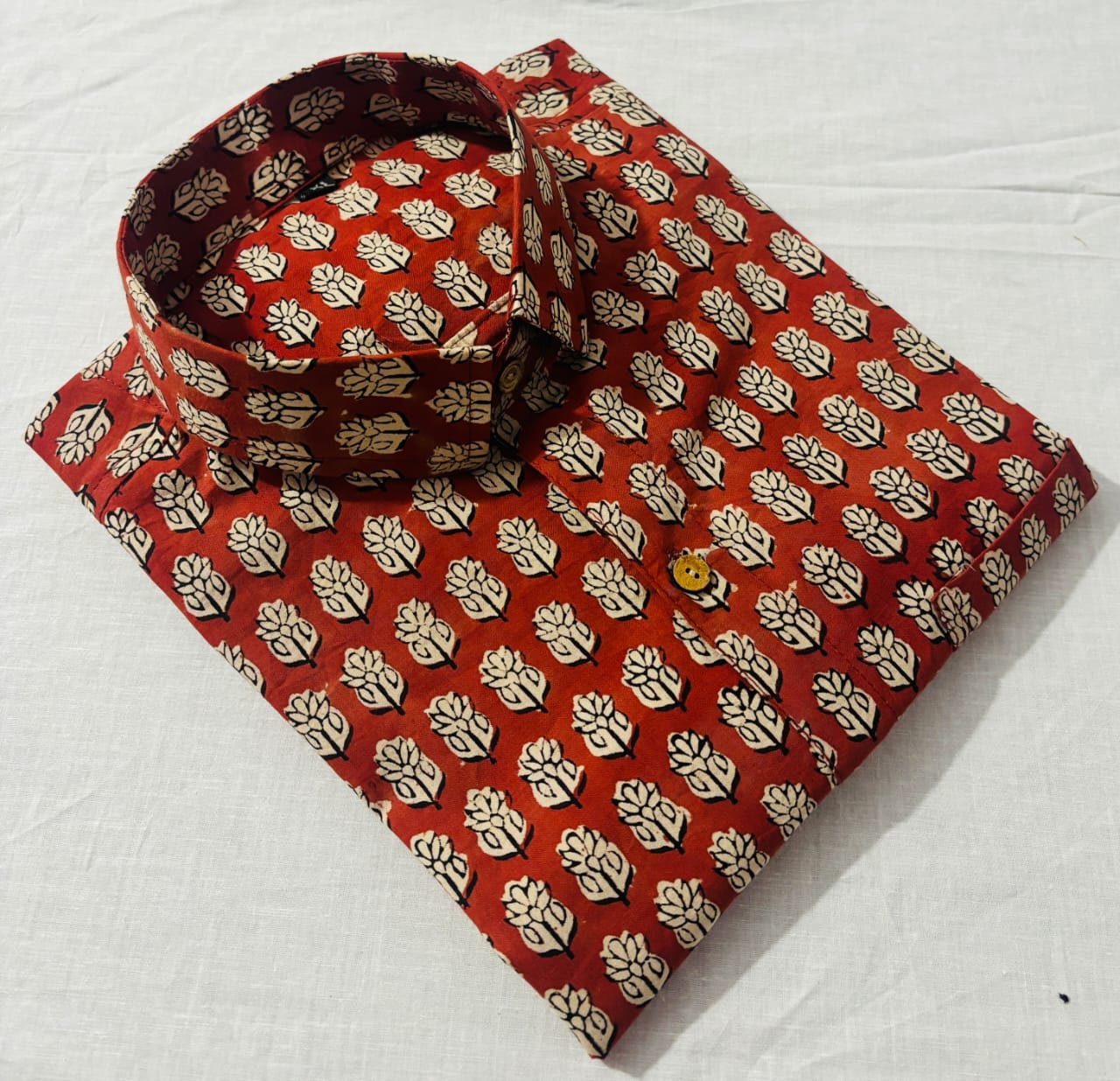 Elevate your wardrobe with our premium Bagru Block Printed Cotton Men's Shirt in a deep reddish-orange hue. Crafted with intricate floral motifs, this shirt is a testament to traditional Indian hand block printing. Made from high-quality cotton 60*60 Super Dying fabric, it offers comfort and style effortlessly. The standard collar and button-down front with contrasting yellowish-brown buttons add a touch of sophistication to your casual or semi-formal look. Embrace the artistry of handcrafted textiles with this exquisite shirt.