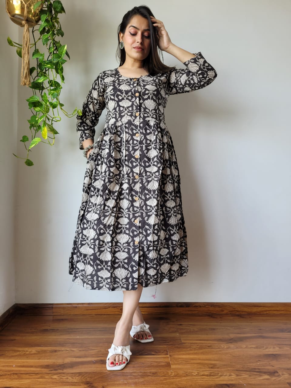 Elevate your wardrobe with our Bagru Block Printed Cotton Midi Dress with Frill Detail. Handcrafted with precision, this dress features a round neckline, full-length sleeves, and a pleated waistline for a flattering silhouette. Made from high-quality cotton 60*60 Super Dying fabric, it offers both style and comfort. The intricate Bagru Block Print adds a touch of artisanal charm, making it a perfect choice for any occasion.