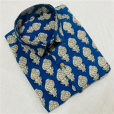 Elevate your wardrobe with our Bagru Block Printed Cotton Shirt with Abstract Design. Crafted with care, this shirt features a classic collar and a unique abstract pattern in off-white on a vibrant blue base. The wooden button adds a touch of rustic charm. Made from premium cotton 60*60 Super Dying fabric, this shirt offers both style and comfort. Embrace traditional Indian craftsmanship with this hand block printed shirt.