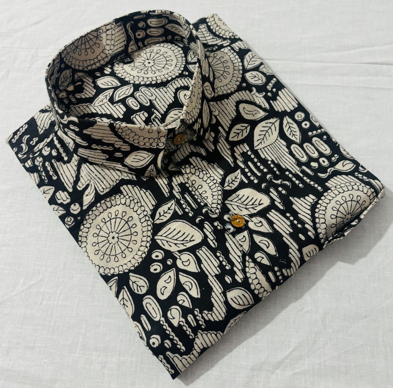 Experience the artistry of Bagru block printing with this exquisite Cotton 60*60 Super Dying Shirt for Men. Handcrafted with precision, this black shirt features a captivating floral motif design in off-white, making it a versatile piece for your casual or semi-formal wardrobe. The classic collar and button-down front with brown buttons add a touch of sophistication. Elevate your style with this premium, artisanal creation from Blockart. Explore more men's shirts for unique handcrafted designs.