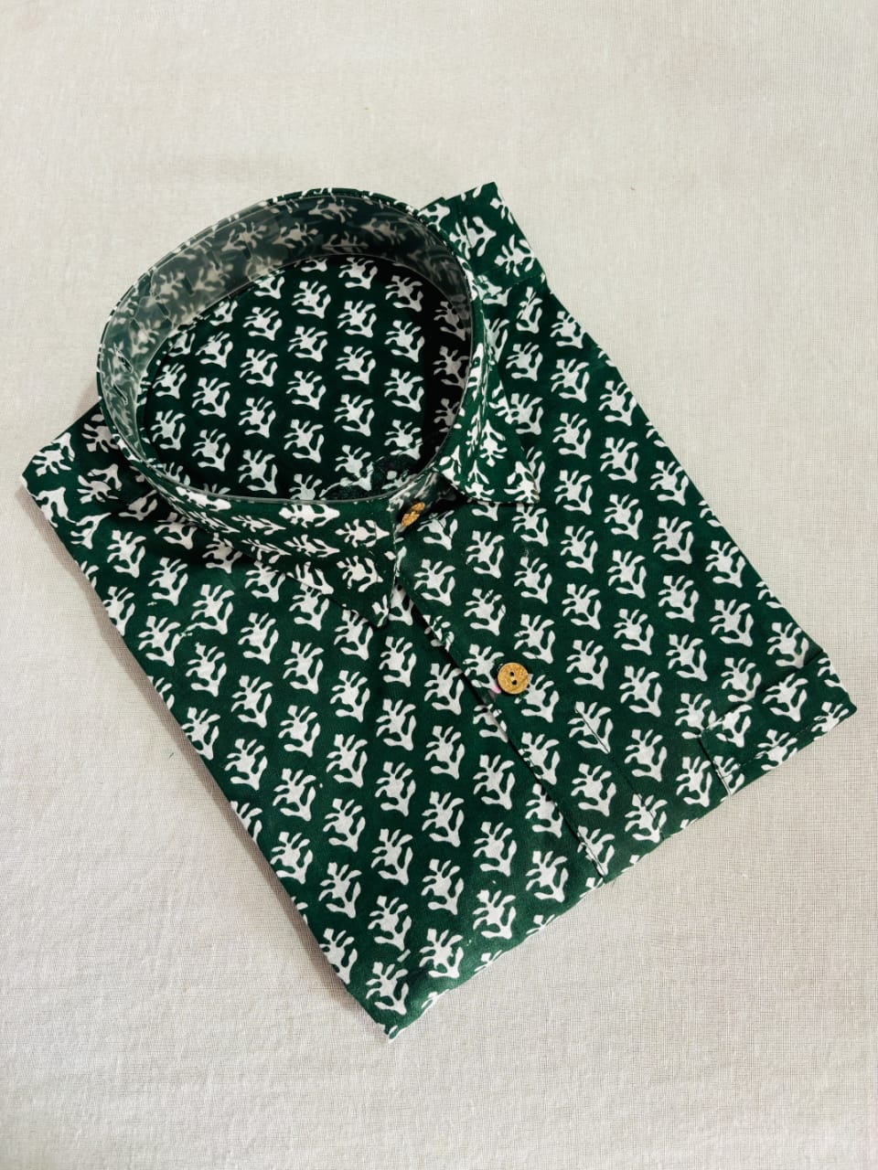 Indulge in the timeless art of hand block printing with our Bagru Block Printed Dark Green Men's Dress Shirt. Crafted from premium cotton 60*60 Super Dying fabric, this shirt exudes traditional charm and artisanal craftsmanship. The button-down collar and wooden buttons add a touch of sophistication to your wardrobe. Experience comfort and style effortlessly with this exquisite piece.