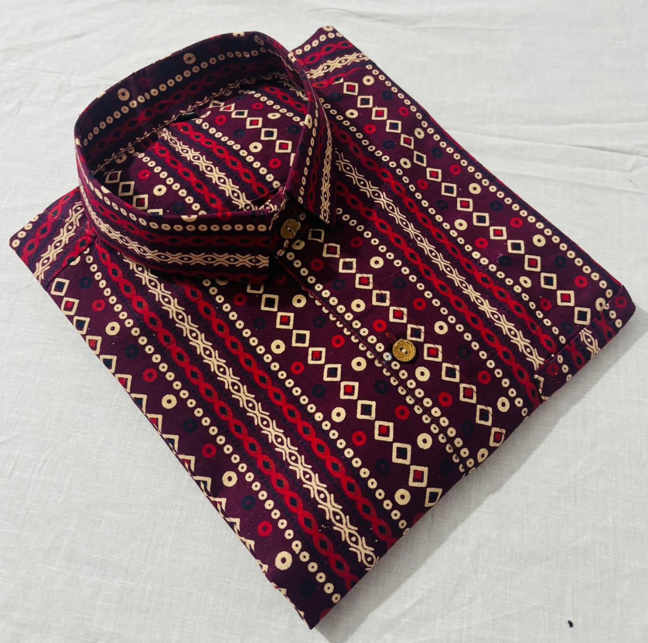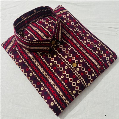 Elevate your style with this exquisite Bagru Block Printed Maroon Cotton Shirt from Blockart. Crafted with precision using premium quality cotton fabric, this shirt showcases intricate geometric patterns in beige, red, and black. The hand block printing technique adds a touch of traditional artistry to your wardrobe. The classic collar and button-down front with brown buttons offer a sophisticated look suitable for casual or semi-formal occasions. Experience comfort and style with this artisanal creation.