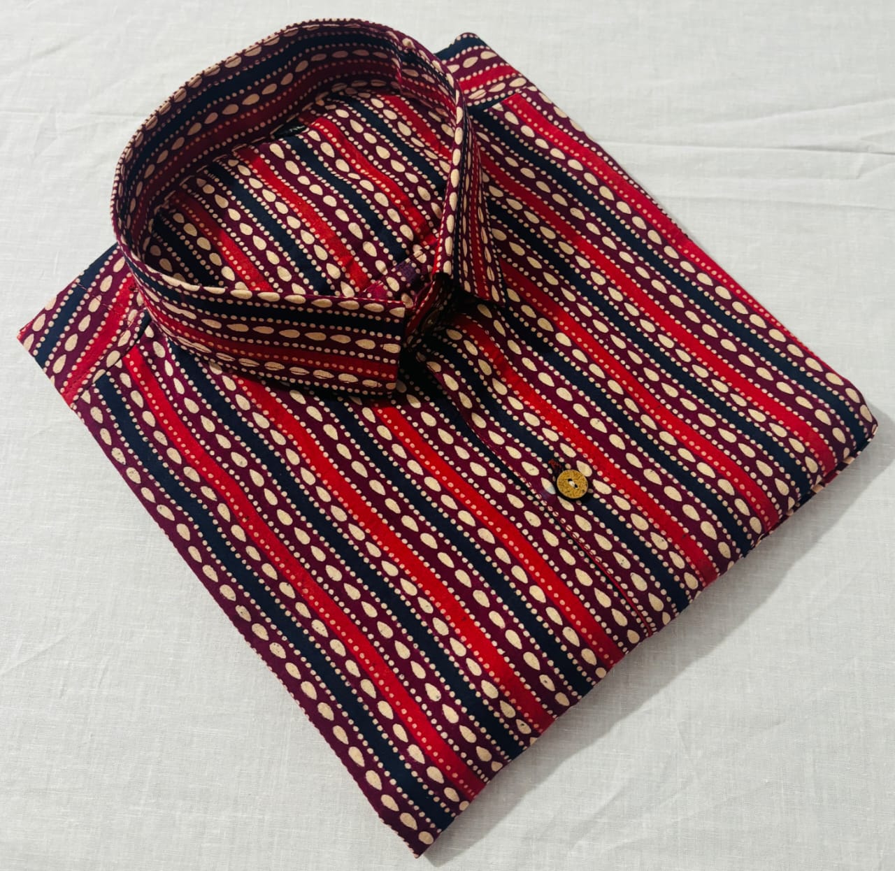 Experience the timeless elegance of traditional Indian craftsmanship with our Bagru Block Printed Maroon Striped Cotton Men's Shirt. Handcrafted with care, this shirt features intricate block printing in a rich maroon hue. Made from premium cotton 60*60 super dying fabric, it offers both style and comfort. The classic collar and button-front design add a touch of sophistication to your ensemble. Elevate your wardrobe with this artisanal piece.