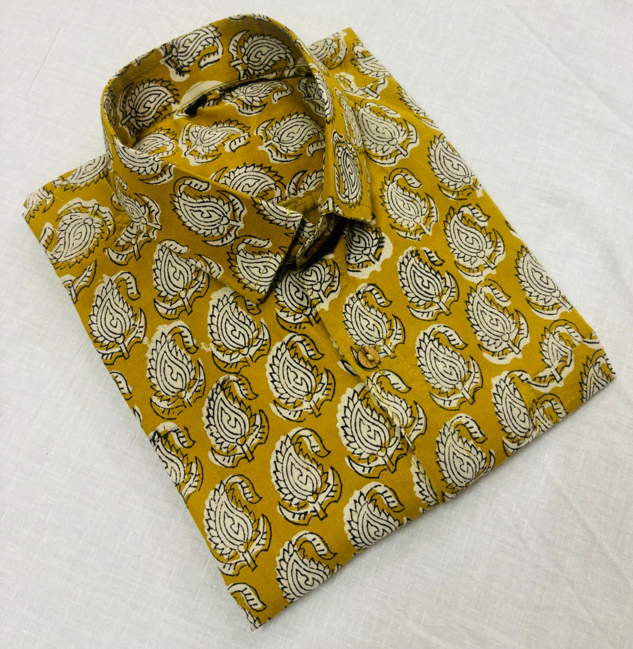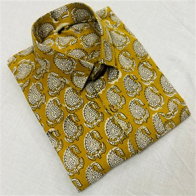Indulge in the traditional artistry with our Bagru Block Printed Mustard Cotton Men's Shirt. Crafted with care using superior quality cotton 60*60 super dying fabric, this shirt offers both style and comfort. The intricate hand block printing showcases the rich heritage of Indian crafts. Embrace the elegance of ethnic wear with this premium shirt.