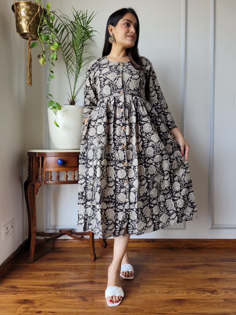 Indulge in timeless elegance with our Bagru Floral Hand Block Printed Cotton Midi Dress. Crafted with care using premium Cotton 60*60 Super Dying fabric, this dress features a beautiful Bagru block print design. The long sleeves, button-down front, and gathered waistline with a flared skirt add a touch of sophistication. Embrace comfort and style with the round neckline and convenient side pockets. Perfect for everyday wear or special occasions.