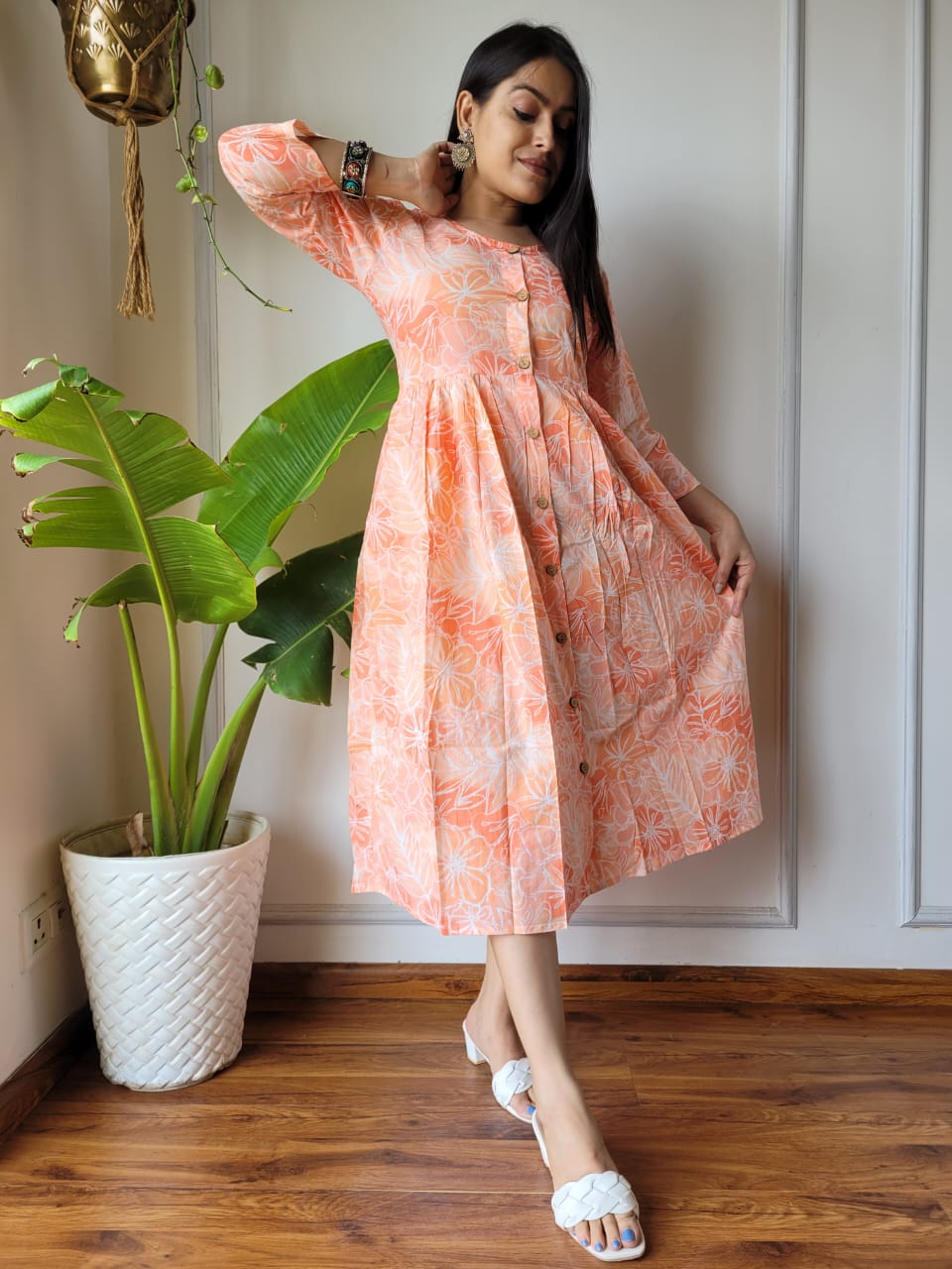Experience the traditional craftsmanship with our Bagru Block Printed Cotton Dress! Made from premium Cotton 60*60 Super Dying fabric, this midi-length dress features a delicate floral print pattern in soft coral and white colors. The button-down front, three-quarter sleeves, and gathered skirt add a stylish flair to your wardrobe. The lightweight and breathable material ensure comfort all day long.