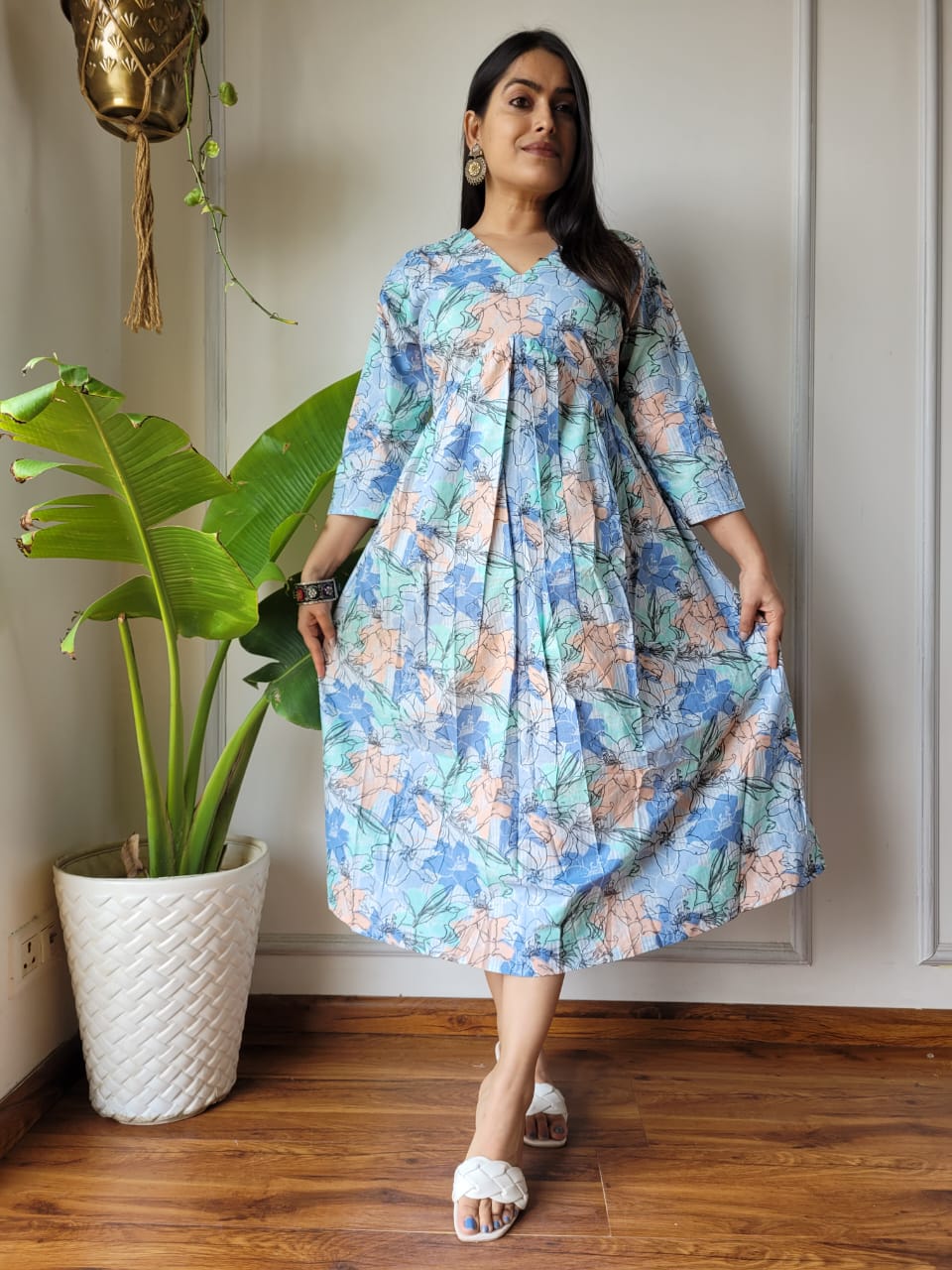 Elevate your wardrobe with our Bagru Hand Block Printed Cotton Dress. Crafted with precision using traditional Bagru block printing techniques, this dress features a charming V-neckline and three-quarter sleeves for a touch of elegance. The pleated design starting from the bust area adds volume and flow to the skirt, enhancing your silhouette. Made from premium cotton 60*60 Super Dying fabric, this dress ensures comfort and breathability all day long. Embrace the artistry of Indian craftsmanship with this exquisite piece.