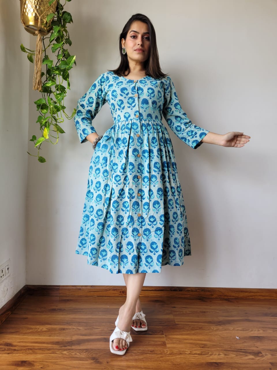 Indulge in the timeless charm of hand block printing with our Bagru Hand Block Printed Cotton Midi Dress. Crafted from premium Cotton 60*60 Super Dying fabric, this dress features a unique Aliya pattern frill detail, adding a touch of artisanal elegance to your wardrobe. The dress showcases a flattering gathered waistline, three-quarter sleeves, and wooden button-down front. Perfect for casual outings or semi-formal events, this dress offers both style and comfort.