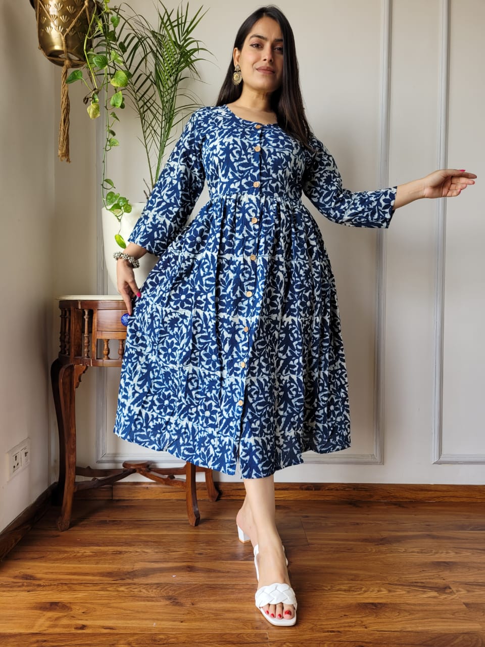 Indulge in timeless elegance with our Bagru Hand Block Printed Cotton Midi Dress. Crafted using premium Cotton 60*60 Super Dying fabric, this dress features a stunning Aliya pattern that exudes traditional charm. The long sleeves, round neckline, and gathered waist create a flattering and flowy silhouette. The front button closure with wooden-look buttons adds a touch of artisanal flair. Perfect for casual outings or gatherings, this dress offers breathability and comfort in style. Elevate your ethnic wardrobe with this handcrafted masterpiece.
