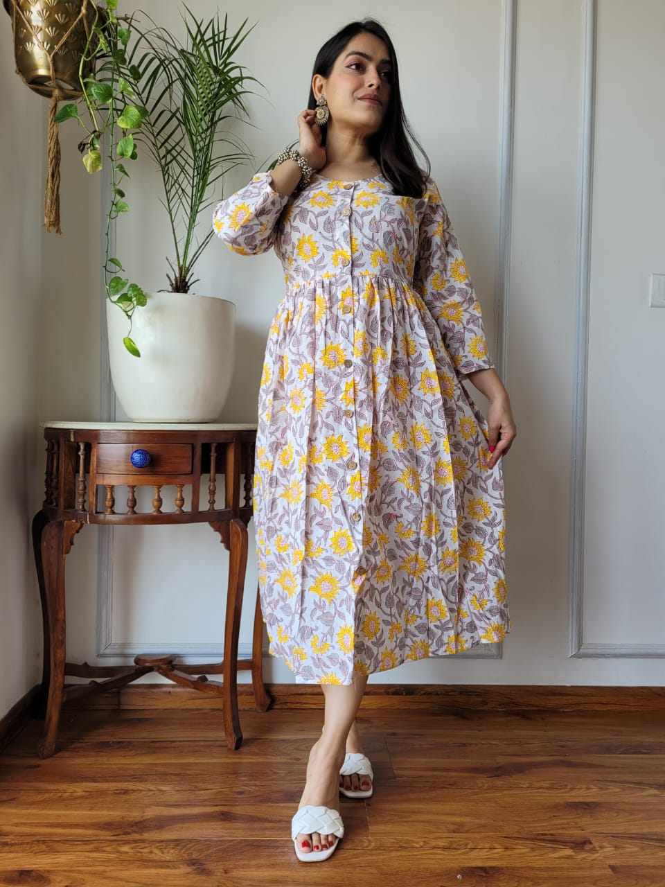 Experience the timeless charm of hand block printing with our Bagru Hand Block Printed Cotton Midi Dress. Crafted with care, this dress features a flowy fit and a stunning yellow floral pattern on a light beige background. Made from high-quality Cotton 60*60 Super Dying fabric, it offers breathability and comfort, perfect for casual or semi-casual occasions. The long sleeves, round neckline, and front buttons add a touch of elegance. Embrace artisanal craftsmanship with this exquisite piece.