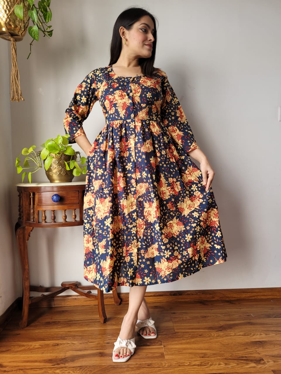 Indulge in the timeless artistry of hand block printing with our Bagru Hand Printed Cotton Flare Dress. Crafted from premium Cotton 60*60 Super Dying fabric, this dress features a vibrant Navy blue base with a dense Mustard and floral pattern. The fit-and-flare silhouette, three-quarter sleeves, and gathered waistline enhance the traditional charm of this piece. Perfect for casual outings or special occasions.