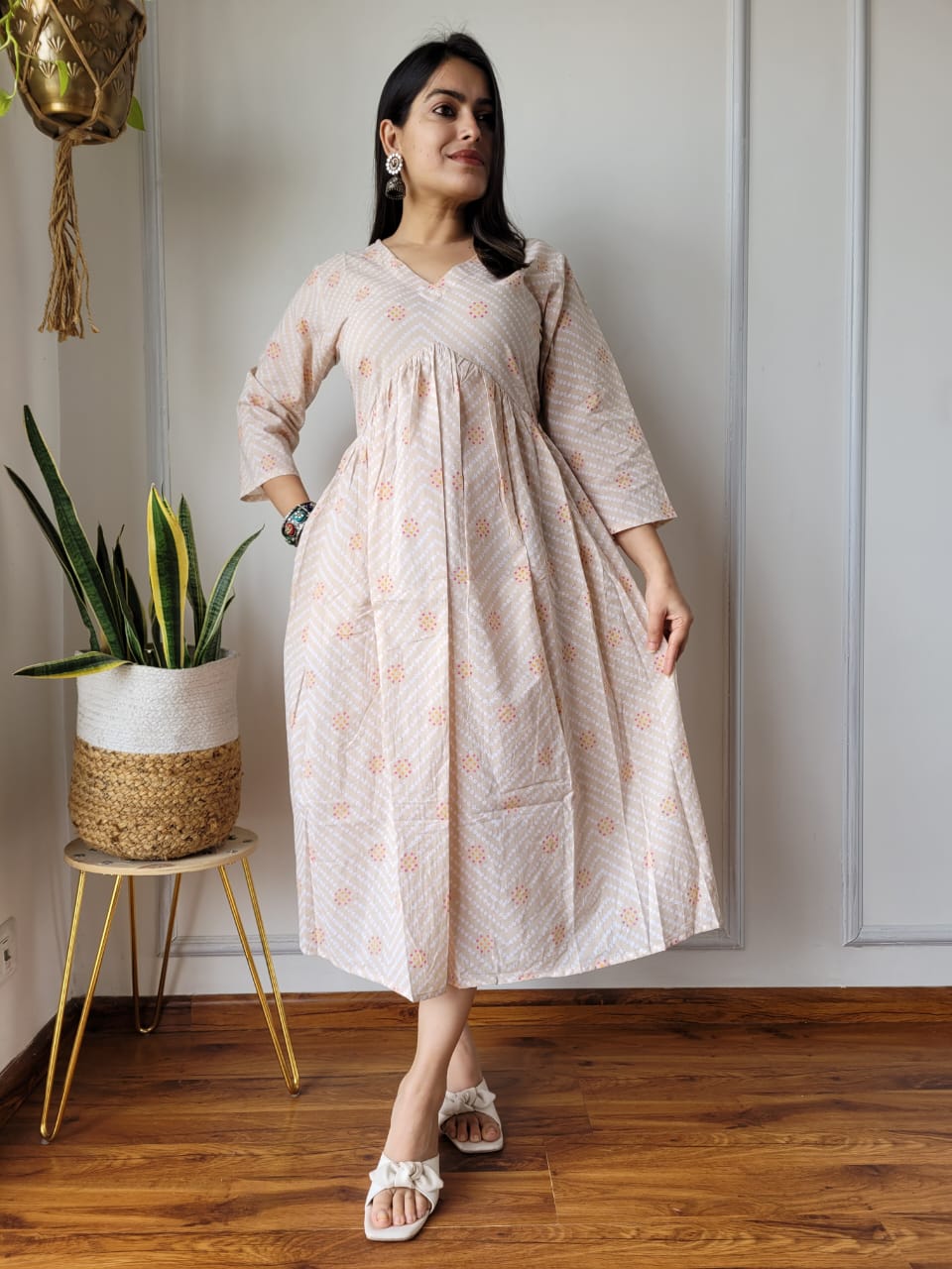 The V-neckline and three-quarter sleeves add a touch of elegance, while the gathered waistline creates a flattering silhouette that flows into a flared skirt, offering both style and comfort. Perfect for casual outings or semi-casual events, this dress exudes a warm, artisanal vibe that celebrates authentic Indian craft.