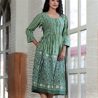 Experience the timeless charm of hand block printing with our Bagru Hand Printed Green Cotton Kurti. Crafted with care using high-quality Cotton 60*60 Super Dying fabric, this kurti features a round neckline, three-quarter sleeves, and a gathered waistline for a flattering fit. The intricate Aliya pattern on the upper part complements the wavy white designs on the skirt, adding a touch of artisanal elegance. Perfect for casual or semi-formal occasions, this kurti is a versatile addition to your wardrobe.