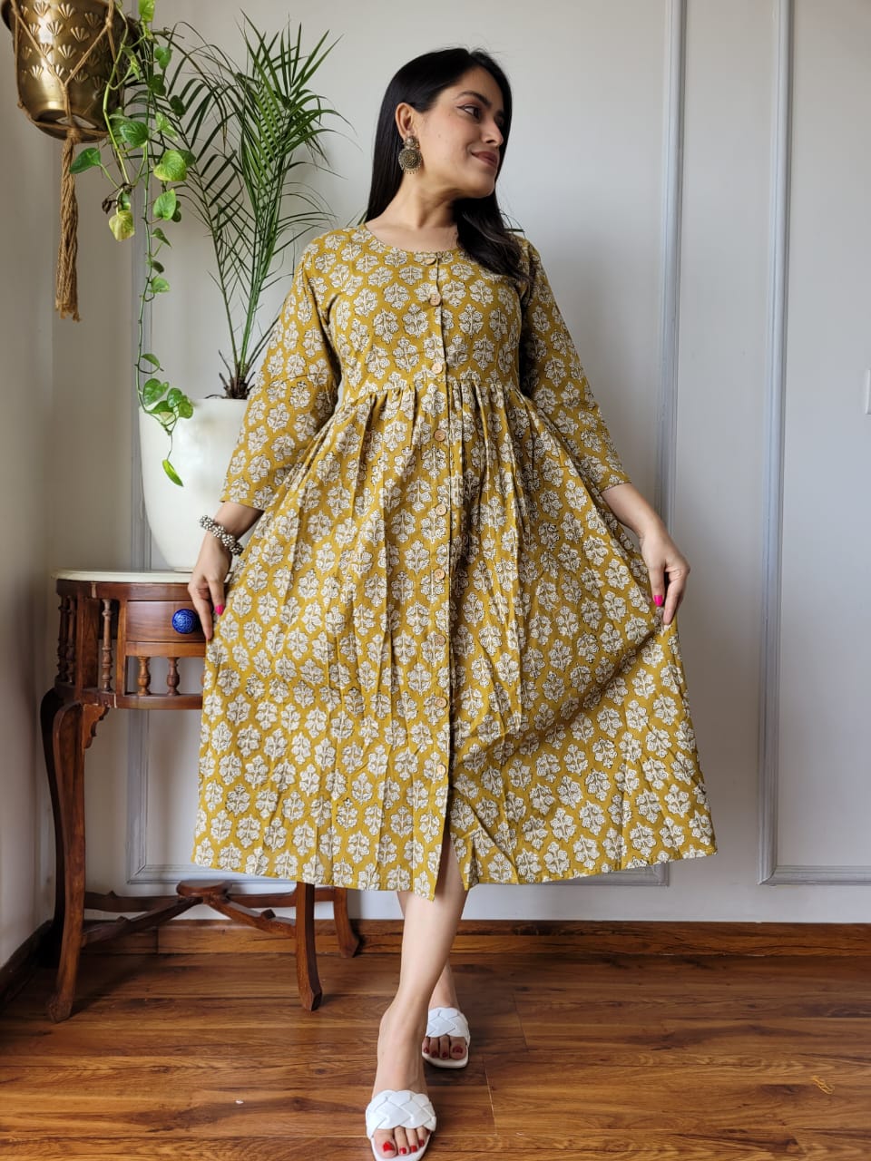 Indulge in the timeless art of hand block printing with our Bagru Mustard Flora Cotton Long Dress. Crafted from premium cotton 60*60 Super Dying fabric, this dress features a Bagru block print, a round neckline, three-quarter sleeves, and a front button-down closure. The gathered waist creates a flattering silhouette, perfect for everyday wear or semi-formal occasions. Embrace the authentic Indian craft with this artisanal piece. Discover more block print dresses