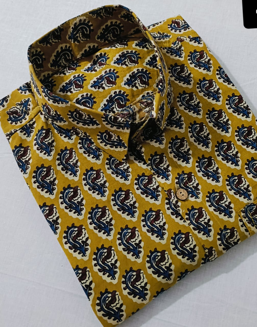 Indulge in traditional Indian craftsmanship with our Bagru Mustard Floral Hand Block Printed Cotton Shirt. Expertly crafted in super-dying cotton fabric, this shirt features a classic collar, wooden-look buttons, and a stunning floral motif in blue and maroon on white ovals against a mustard yellow backdrop. The intricate hand block printing adds a touch of artisanal charm, making each piece unique. Embrace comfort and style effortlessly with this premium ethnic wear.