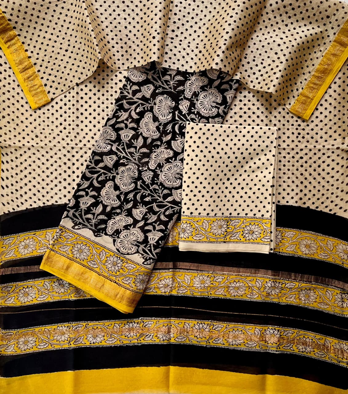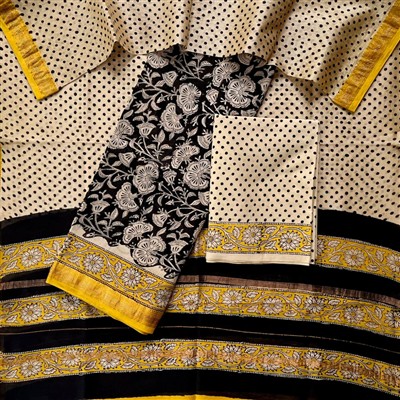 Enhance your ethnic wardrobe with this exquisite Bagru print Maheshwari silk suit set. Unleash your creativity with: