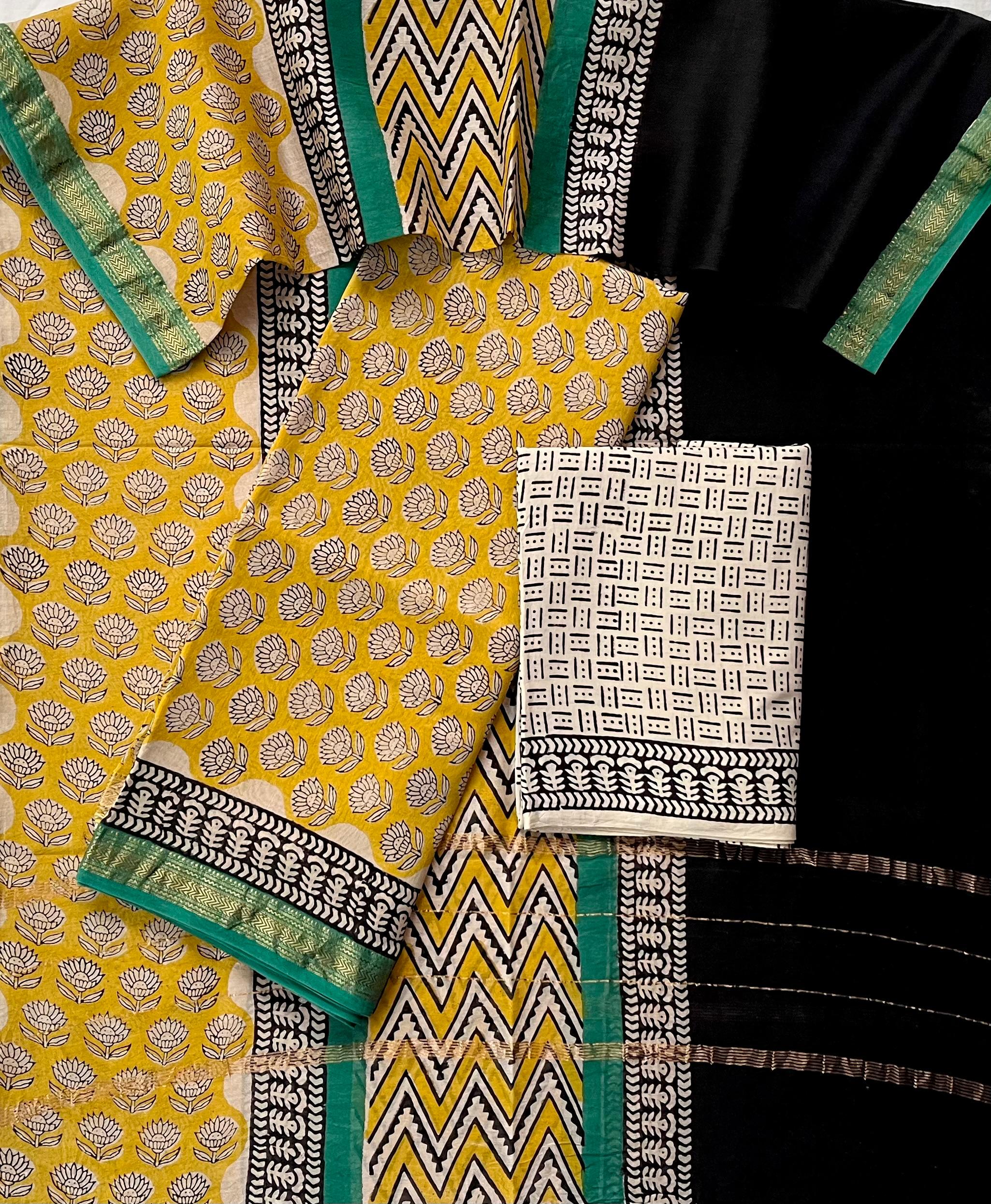 Elevate your ethnic wardrobe with this exquisite Bagru Print Maheshwari Silk Unstitched Suit Fabric Set. Crafted with premium Maheshwari silk fabric for the dupatta and top, and 60x60 super dyeing cotton for the bottom, this set exudes elegance and comfort. The traditional Bagru print, hand block printed by skilled artisans, adds a touch of authentic Indian craftsmanship to your attire. Embrace the rich cultural heritage with this handcrafted fabric set, perfect for tailored ethnic wear.
