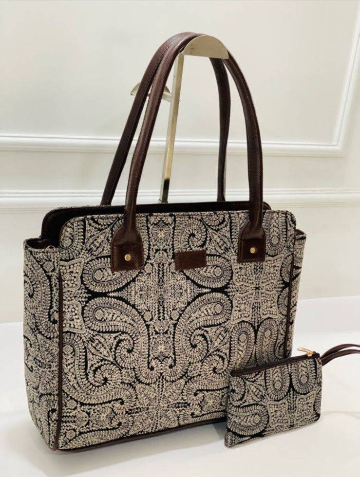 Immerse yourself in the timeless elegance of this Beige and Black Paisley Floral Tote Bag Set. Crafted from intricately woven fabric, this set exudes sophistication and charm. The tote bag offers ample space with its double partition, ideal for daily essentials. The pouch, perfect for small items, complements the set beautifully. Experience the artisanal craftsmanship that went into creating the detailed paisley and floral pattern. The nylon water-resistant fabric ensures durability, making this set a versatile and stylish addition to your wardrobe. Pair the tote with casual outfits or elevate your work attire with its classic design. Care for this exquisite set by spot cleaning as needed to maintain its pristine condition. Elevate your style effortlessly with this handcrafted Tote Bag Set from Blockart.