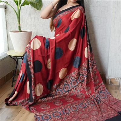 Embrace the elegance of Indian tradition with our Beige and Blue Polka Dot Modal Silk Saree. This saree features a deep red base adorned with large polka dots in beige and dark blue, enhancing its timeless appeal. The intricate traditional motifs and floral designs on the border and pallu add a touch of sophistication.