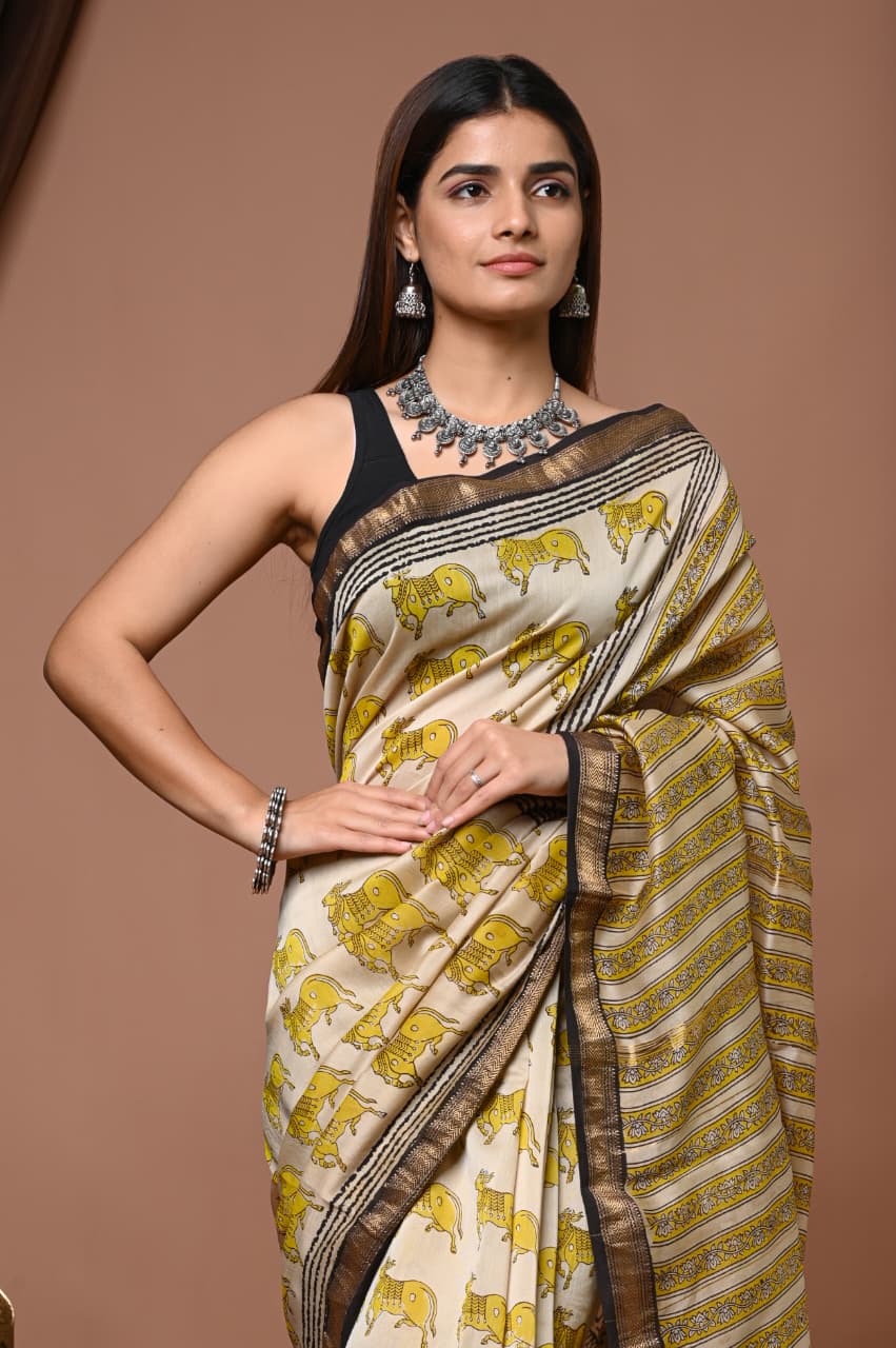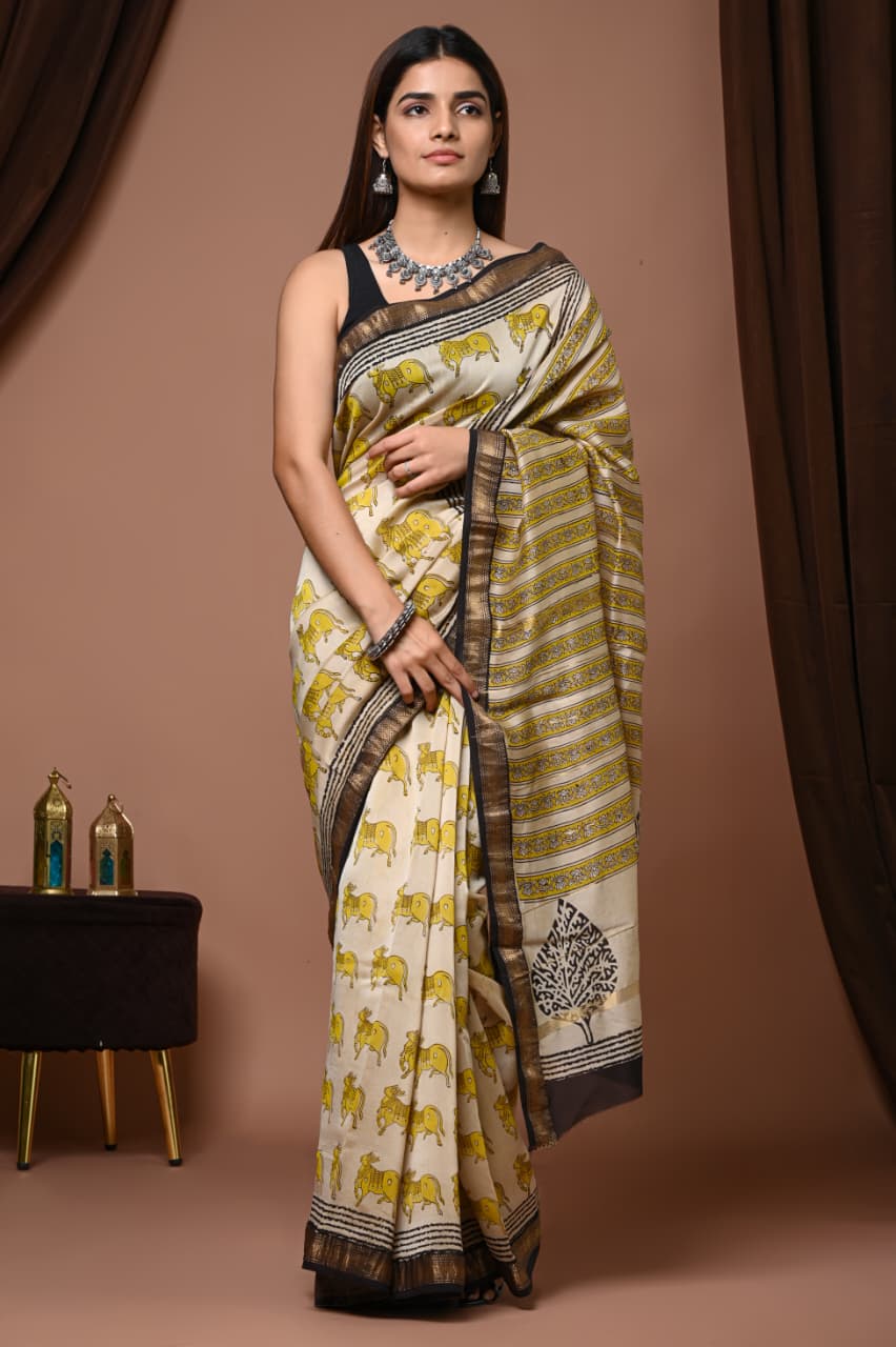 Celebrate the vibrant spirit of Indian craftsmanship with this enchanting beige saree, adorned with playful elephant motifs in a striking mustard hue. A beautiful testament to Bagru's rich heritage, it combines traditional artistry with contemporary elegance.
