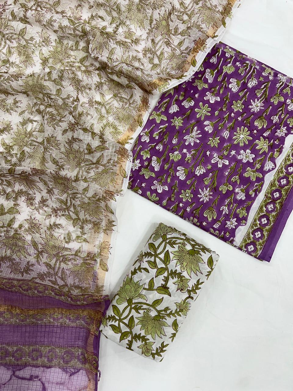 Drawing inspiration from the intricate artistry that defines Indian textiles, this set embodies a timeless charm. The light beige backdrop is adorned with olive green and muted gold floral motifs, creating a serene yet captivating visual. The accompanying deep violet Kota Doria dupatta, with its delicate white floral designs, adds a touch of contrast, making it a versatile choice for various occasions.
