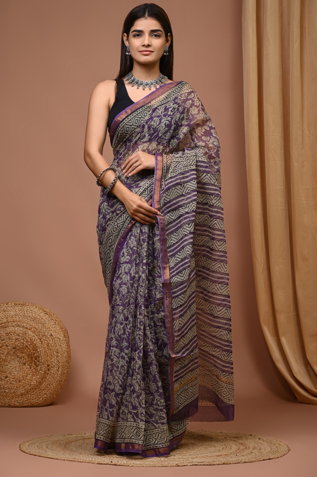 Embrace the artistry of hand block printing with this exquisite Beige Floral Kota Doria Saree. Crafted from premium kota doria fabric, this saree features intricate floral and geometric prints in purple and beige. The lightweight and semi-transparent fabric drapes elegantly, making it perfect for formal or festive occasions. The contrasting border with a hint of golden lining adds a touch of sophistication. Elevate your ethnic wardrobe with this artisanal masterpiece.
