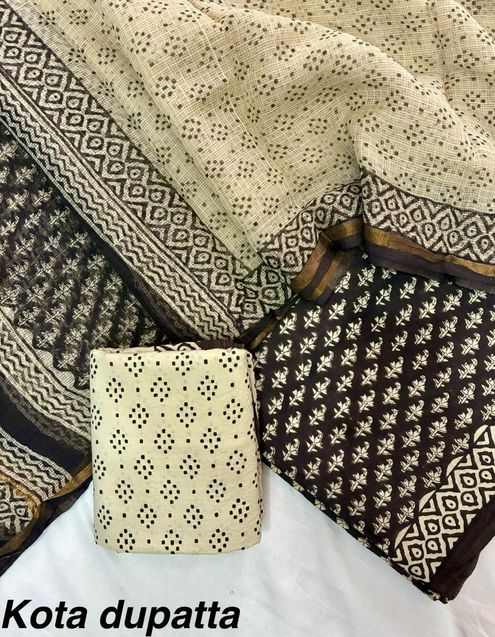 Rooted in the rich heritage of Indian craftsmanship, this exquisite dress material features a delightful interplay of soft beige and deep brown, adorned with intricate geometric and floral motifs. The artisan-crafted block print technique showcases meticulous attention to detail, making each piece a unique representation of traditional artistry.