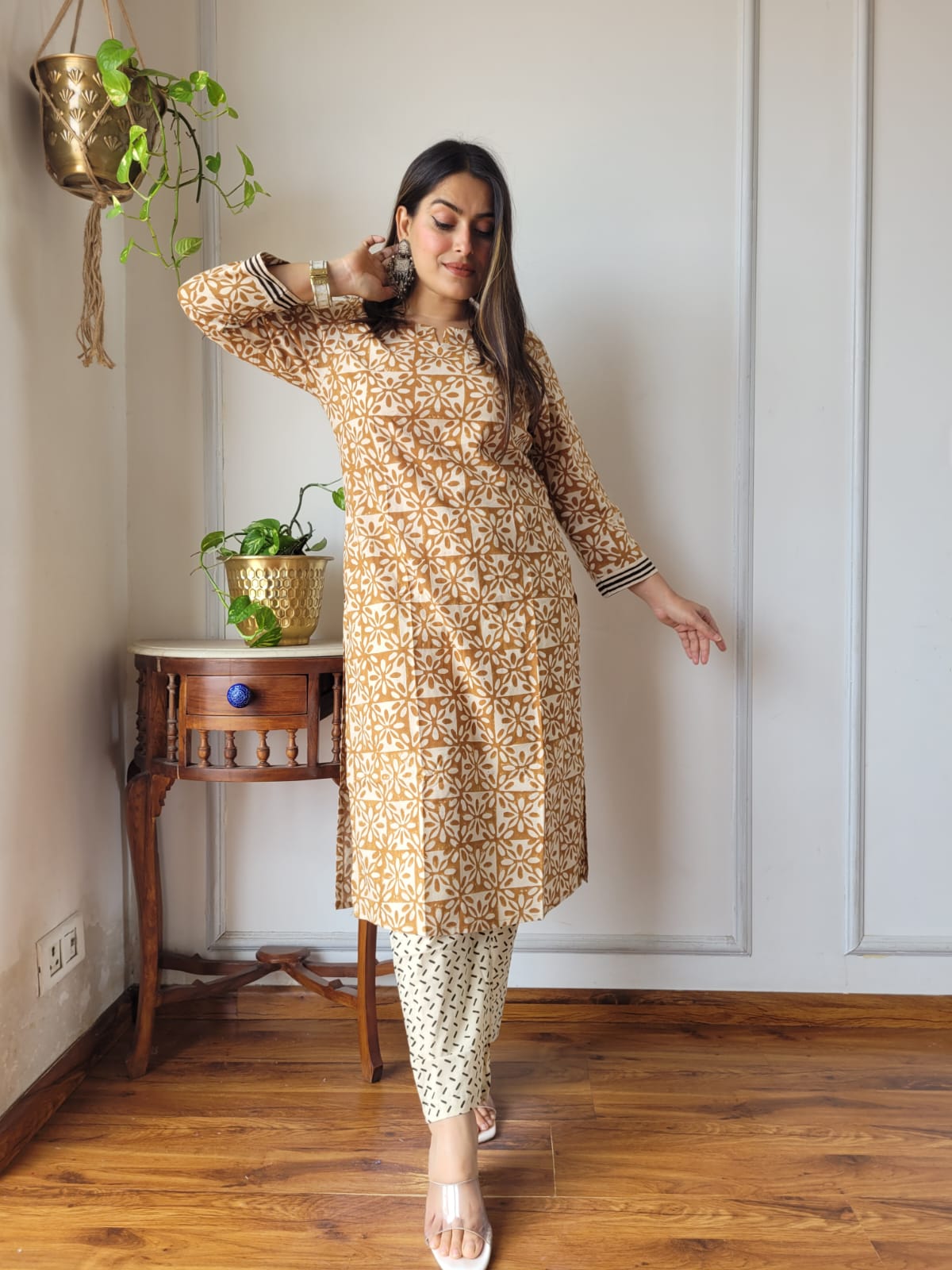 Striking just the right balance between artistic heritage and contemporary flair, this beige kurti set delights the senses with its intricate geometric floral patterns. The smooth cotton fabric wraps you in comfort, while the soft caramel accents breathe life into your everyday look.