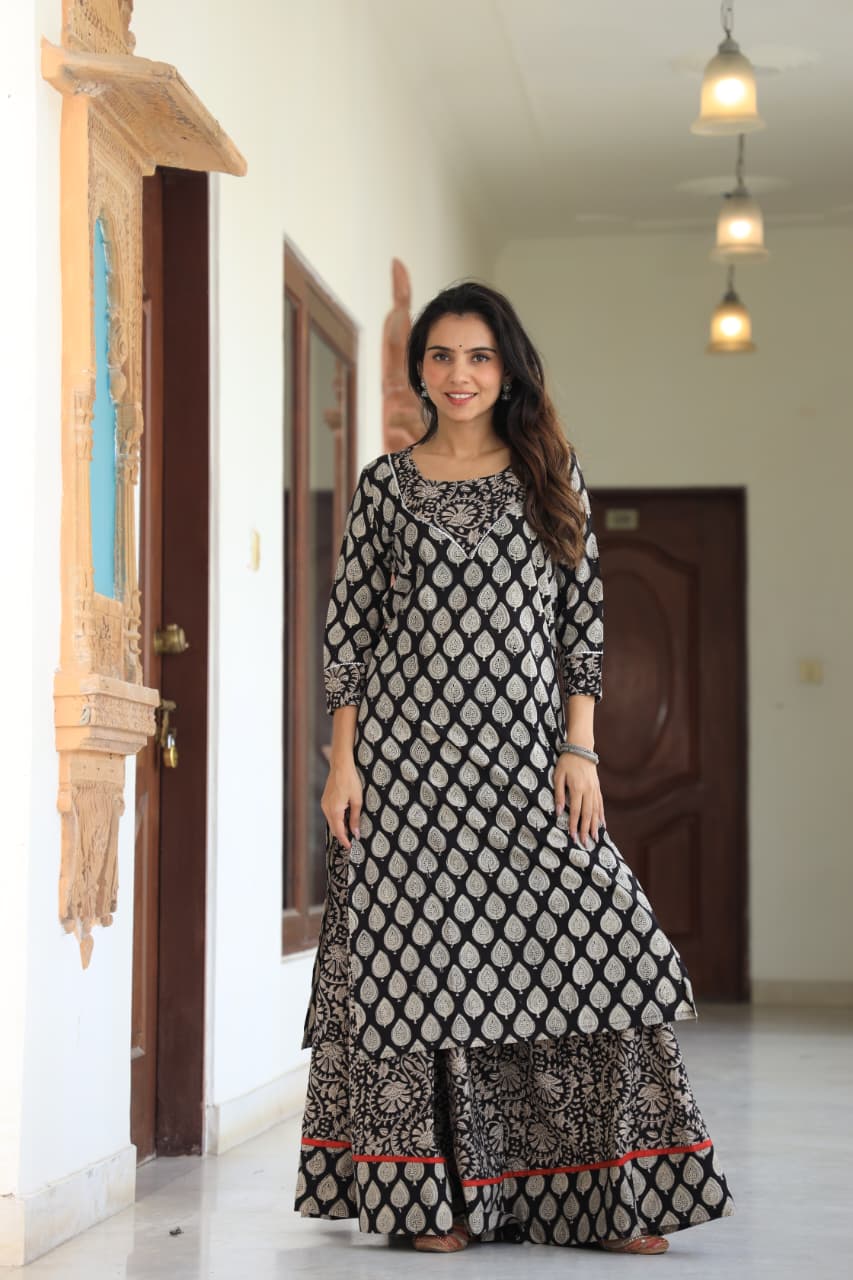 Elevate your ethnic wardrobe with this exquisite hand block printed cotton kurta and skirt set. Crafted with precision and care, this ensemble features intricate beige leaf motifs adorning the black kurta and a mix of floral patterns on the floor-length skirt. The kurta boasts detailed embroidery around the neckline and side slits for ease of movement, while the flared skirt is accentuated with a contrasting red border. Experience the beauty of traditional Indian craftsmanship with this premium outfit.