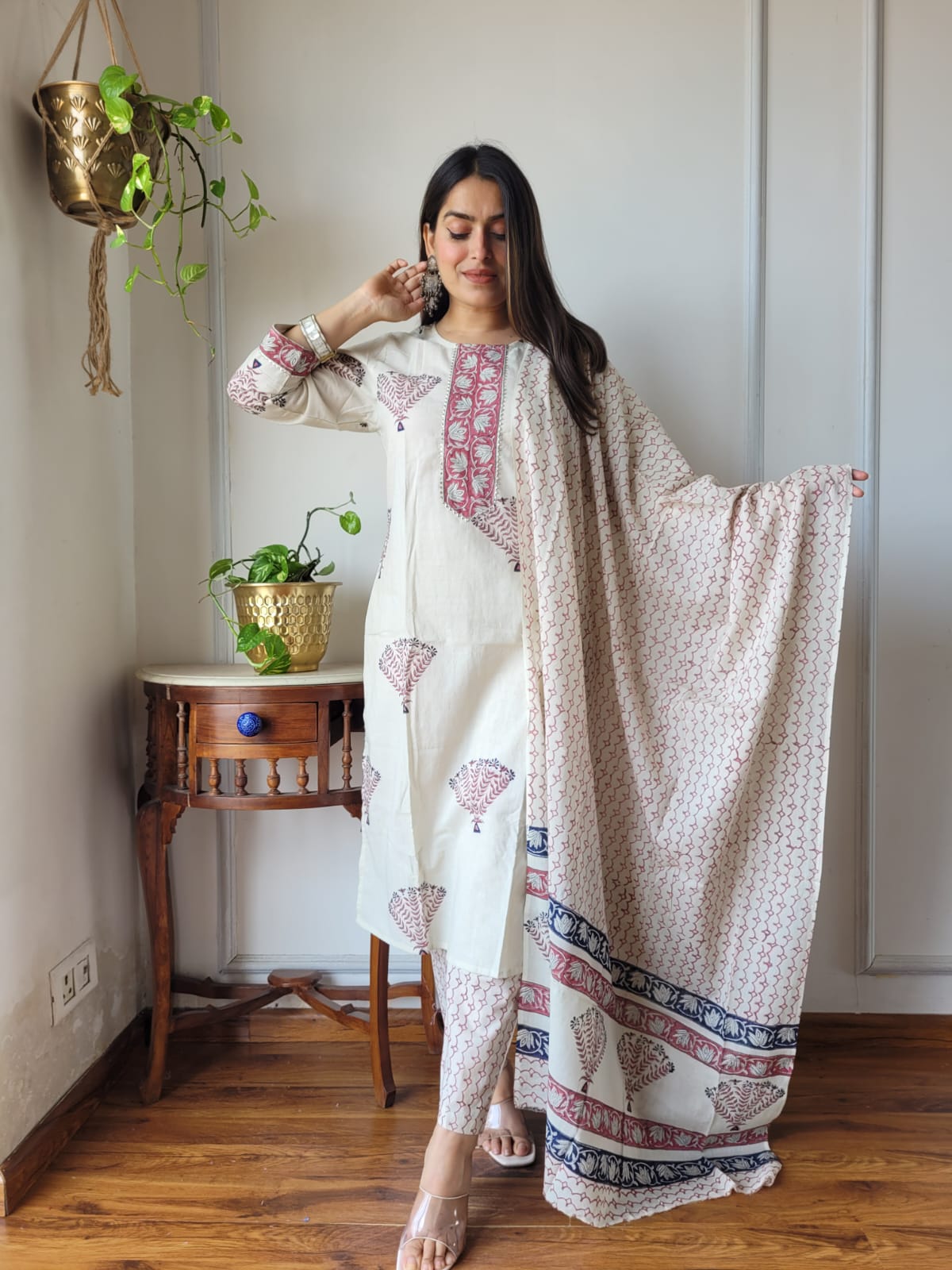 Step into a realm where traditional artistry meets everyday elegance with this exquisite cotton suit set. The soft, creamy beige serves as a gentle canvas, allowing the deep maroon and navy blue paisley patterns to breathe life into the garment. Each piece is crafted with meticulous attention, reflecting the timeless beauty of hand block printing.