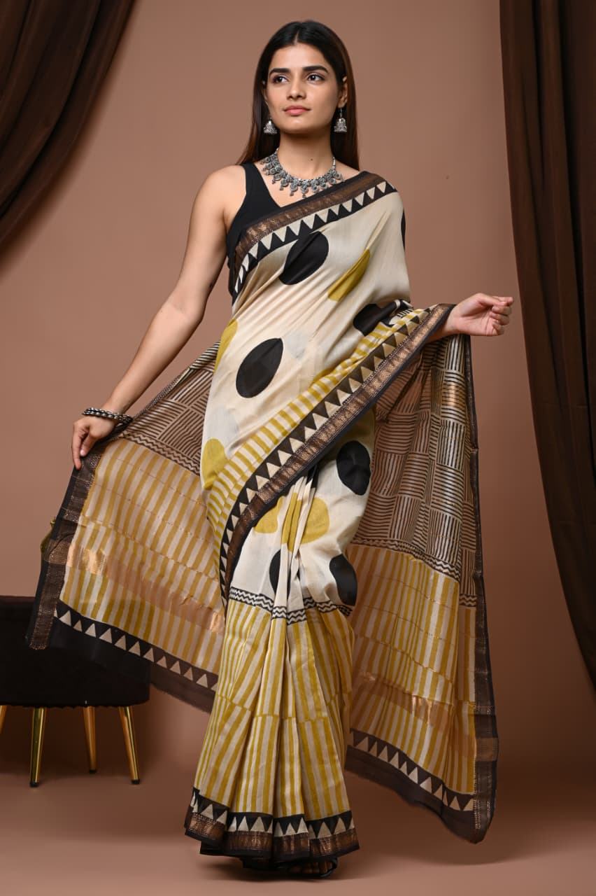 In the vibrant realm of Indian textiles, this exquisite saree captures the essence of tradition with a contemporary twist. The creamy beige fabric serves as a canvas for playful mustard yellow polka dots, creating a cheerful contrast that radiates joy. The intricate geometric borders, highlighted by deep brown and metallic accents, invite admiration and intrigue.
