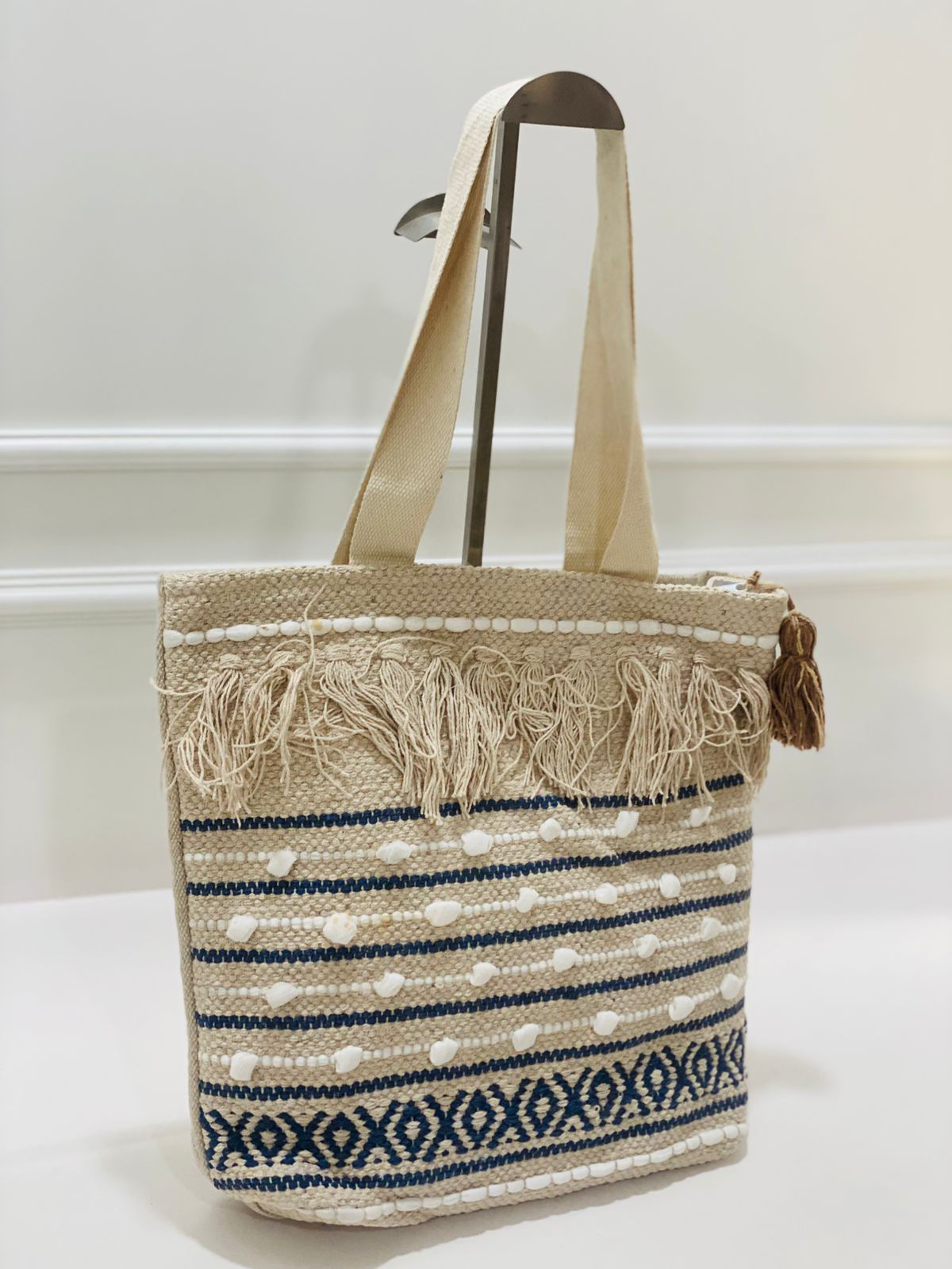 Immerse yourself in the charm of our Beige Polka Stripe Woven Jhola Bag, where the elegance of classic Indian weaving meets a playful spirit. Crafted with care, this unique bag features a sandy beige backdrop adorned with bold navy blue stripes and whimsical white polka dots, creating an engaging visual story. The exquisite geometric motif at the base invites you to explore the fine details of its artisan craftsmanship.
