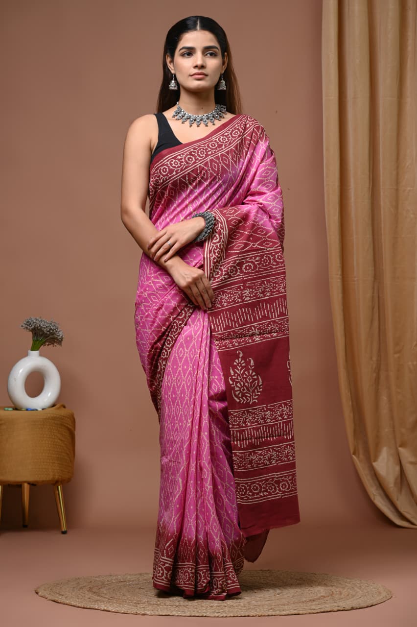 Drape yourself in the ethereal softness of this exquisite Blockart Ruby and Pink Mulmul Saree. Celebrating the finesse of traditional Indian craftsmanship, this saree features authentic hand block printing on lightweight, buttery soft Mulmul cotton.
